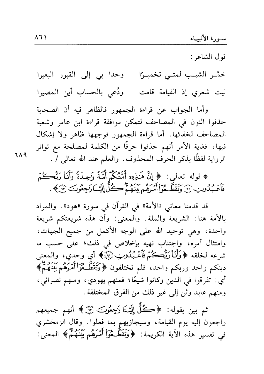 قد قدمنا معاني "الأمة" في القرآن في سورة "هود". والمراد بالأمة هنا: الشريعة والملة. والمعنى: وأن هذه شريعتكم شريعة واحدة، وهي توحيد الله على الوجه الأكمل من جميع الجهات، وامتثال أمره، واجتناب نهيه بإخلاص في ذلك؛ على حسب ما شرعه لخلقه {وَأَنَا رَبُّكُمْ فَاعْبُدُونِ (٩٢)} أي وحدي، والمعنى دينكم واحد وربكم واحد، فلم تختلفون {وَتَقَطَّعُوا أَمْرَهُمْ بَينَهُمْ} أي: تفرقوا في الدين وكانوا شيعًا؛ فمنهم يهودي، ومنهم نصراني، ومنهم عابد وثن إلى غير ذلك من الفرق المختلفة.