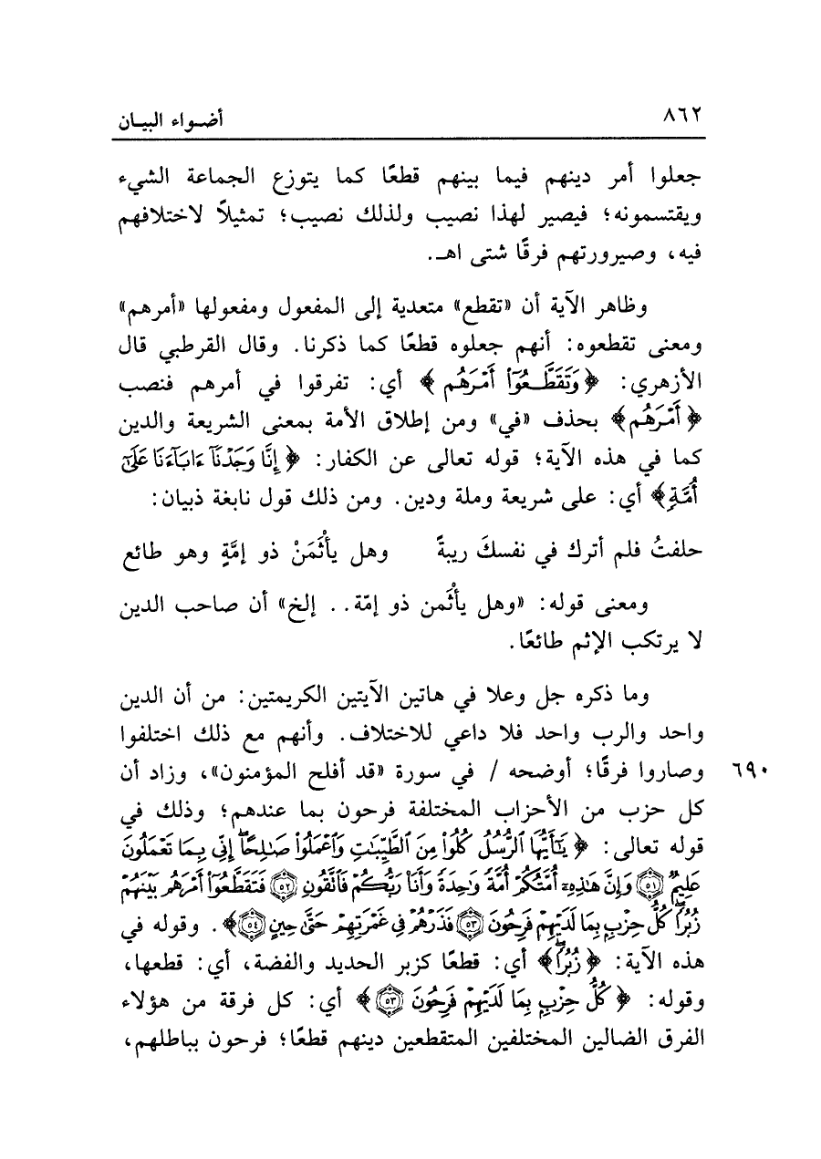 وظاهر الآية أن "تقطع" متعدية إلى المفعول ومفعولها "أمرهم" ومعنى تقطعوه: أنهم جعلوه قطعًا كما ذكرنا. وقال القرطبي قال الأزهري: {وَتَقَطَّعُوا أَمْرَهُمْ} أي: تفرقوا في أمرهم فنصب {أَمْرَهُمْ} بحذف "في" ومن إطلاق الأمة بمعنى الشريعة والدين كما في هذه الآية؛ قوله تعالى عن الكفار: {إِنَّا وَجَدْنَا آبَاءَنَا عَلَى أُمَّةٍ} أي: على شريعة وملة ودين. ومن ذلك قول نابغة ذبيان: