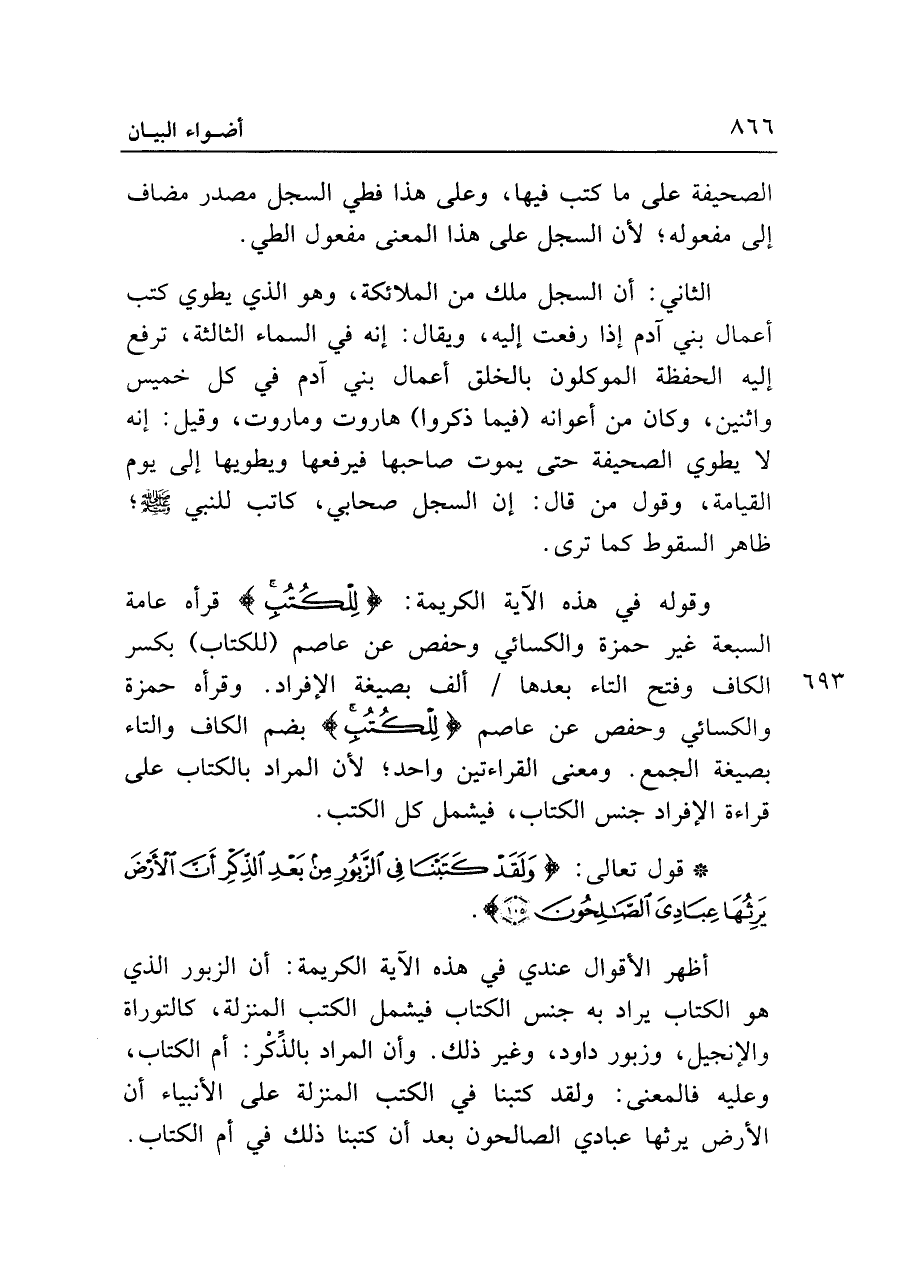 وقوله في هذه الآية الكريمة: {لِلْكُتُبِ} قرأه عامة السبعة غير حمزة والكسائي وحفص عن عاصم (للكتاب) بكسر الكاف وفتح التاء بعدها ألف بصيغة الإفراد. وقرأه حمزة والكسائي وحفص عن عاصم {لِلْكُتُبِ} بضم الكاف والتاء بصيغة الجمع. ومعنى القراءتين واحد؛ لأن المراد بالكتاب على قراءة الإفراد جنس الكتاب، فيشمل كل الكتب.