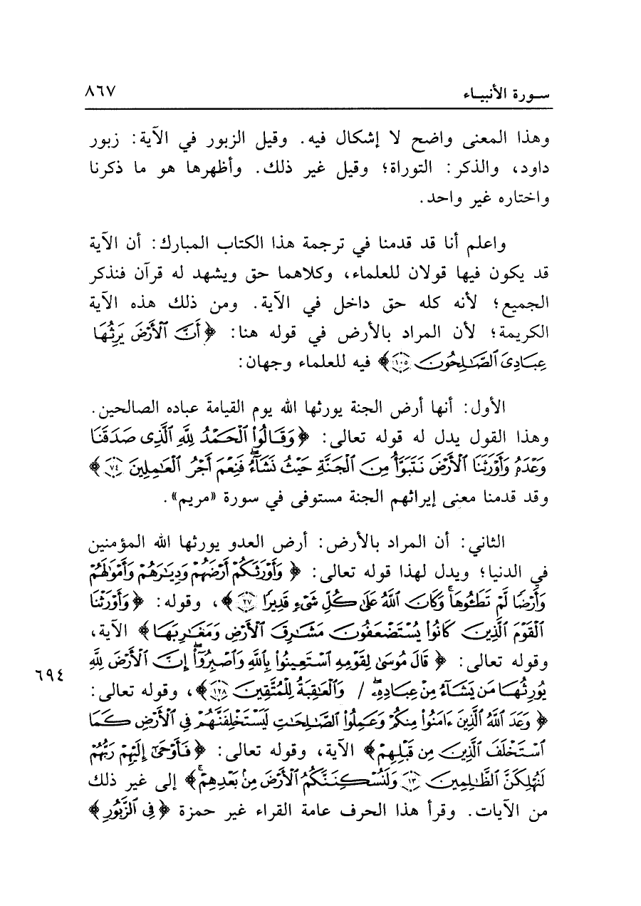 الثاني: أن المراد بالأرض: أرض العدو يورثها الله المؤمنين في الدنيا؛ ويدل لهذا قوله تعالى: {وَأَوْرَثَكُمْ أَرْضَهُمْ وَدِيَارَهُمْ وَأَمْوَالهُمْ وَأَرْضًا لَمْ تَطَئُوهَا وَكَانَ اللَّهُ عَلَى كُلِّ شَيءٍ قَدِيرًا (٢٧)} , وقوله: {وَأَوْرَثْنَا الْقَوْمَ الَّذِينَ كَانُوا يُسْتَضْعَفُونَ مَشَارِقَ الْأَرْضِ وَمَغَارِبَهَا} الآية، وقوله تعالى: {قَال مُوسَى لِقَوْمِهِ اسْتَعِينُوا بِاللَّهِ وَاصْبِرُوا إِنَّ الْأَرْضَ لِلَّهِ يُورِثُهَا مَنْ يَشَاءُ مِنْ عِبَادِهِ وَالْعَاقِبَةُ لِلْمُتَّقِينَ (١٢٨)}، وقوله تعالى: {وَعَدَ اللَّهُ الَّذِينَ آمَنُوا مِنْكُمْ وَعَمِلُوا الصَّالِحَاتِ لَيَسْتَخْلِفَنَّهُمْ فِي الْأَرْضِ كَمَا اسْتَخْلَفَ الَّذِينَ مِنْ قَبْلِهِمْ} الآية، وقوله تعالى: {فَأَوْحَى إِلَيهِمْ رَبُّهُمْ لَنُهْلِكَنَّ الظَّالِمِينَ (١٣) وَلَنُسْكِنَنَّكُمُ الْأَرْضَ مِنْ بَعْدِهِمْ} إلى غير ذلك من الآيات. وقرأ هذا الحرف عامة القراء غير حمزة {فِي الزَّبُورِ}