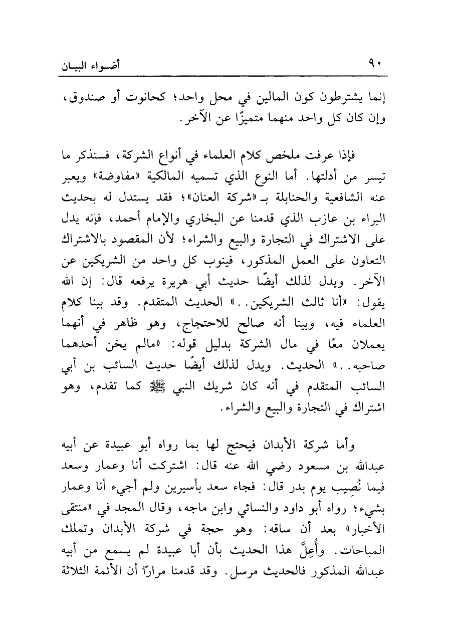 فإذا عرفت ملخص كلام العلماء في أنواع الشركة، فسنذكر ما تيسر من أدلتها. أما النوع الذي تسميه المالكيّة "مفاوضة" ويعبر عنه الشَّافعية والحنابلة بـ"شركة العنان"؛ فقد يستدل له بحديث البراء بن عازب الذي قدمنا عن البُخاريّ والإمام أحمد، فإنَّه يدل على الاشتراك في التجارة والبيع والشراء؛ لأنَّ المقصود بالاشتراك التعاون على العمل المذكور، فينوب كل واحد من الشريكين عن الآخر. ويدل لذلك أيضًا حديث أبي هريرة يرفعه قال: إن الله يقول: "أنا ثالث الشريكين .. " الحديث المتقدم. وقد بينا كلام العلماء فيه، وبينا أنَّه صالح للاحتجاج، وهو ظاهر في أنَّهما يعملان معًا في مال الشركة بدليل قوله: "ما لم يخن أحدهما صاحبه .. " الحديث. ويدل لذلك أيضًا حديث السائب بن أبي السائب المتقدم في أنَّه كان شريك النَّبيّ - صلى الله عليه وسلم - كما تقدم، وهو اشتراك في التجارة والبيع والشراء.
