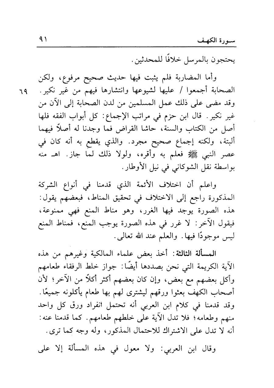 المسألة الثالثة: أخذ بعض علماء المالكيّة وغيرهم من هذه الآية الكريمة التي نحن بصددها أيضًا: جواز خلط الرفقاء طعامهم وأكل بعضهم مع بعض، وإن كان بعضهم أكثر أكلًا من الآخر؛ لأنَّ أصحاب الكهف بعثوا ورقهم ليشترى لهم بها طعام يأكلونه جميعًا. وقد قدمنا في كلام ابن العربي أنَّه تحتمل انفراد ورق كل واحد منهم وطعامه؛ فلا تدل الآية على خلطهم طعامهم. كما قدمنا عنه: أنَّه لا تدل على الاشتراك للاحتمال المذكور، وله وجه كما ترى.