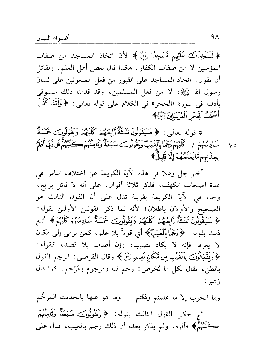 أخبر جل وعلا في هذه الآية الكريمة عن اختلاف النَّاس في عدة أصحاب الكهف، فذكر ثلاثة أقوال. على أنَّه لا قائل برابع، وجاء في الآية الكريمة بقرينة تدل على أن القول الثالث هو الصَّحيح والأولان باطلان؛ لأنَّه لما ذكر القولين الأولين بقوله: {سَيَقُولُونَ ثَلَاثَةٌ رَابِعُهُمْ كَلْبُهُمْ وَيَقُولُونَ خَمْسَةٌ سَادِسُهُمْ كَلْبُهُمْ} أتبع ذلك بقوله: {رَجْمًا بِالْغَيْبِ} أي قولًا بلا علم، كمن يرمى إلى مكان لا يعرفه فإنَّه لا يكاد يصيب، وإن أصاب بلا قصد، كقوله: {وَيَقْذِفُونَ بِالْغَيْبِ مِنْ مَكَانٍ بَعِيدٍ (٥٣)} وقال القرطبي: الرجم القول بالظن، يقال لكل ما يُخرص: رجم فيه ومرجوم ومُرْجم، كما قال زهير: