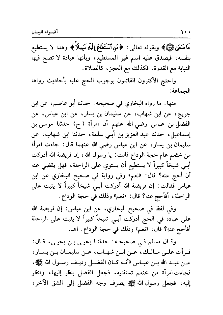 منها: ما رواه البخاري في صحيحه: حدثنا أبو عاصم، عن ابن جريج، عن ابن شهاب، عن سليمان بن يسار، عن ابن عباس، عن الفضل بن عباس - رضي الله عنهم - أن امرأة (ح) حدثنا موسى بن إسماعيل، حدثنا عبد العزيز بن أبي سلمة، حدثنا ابن شهاب، عن سليمان بن يسار، عن ابن عباس - رضي الله عنهما - قال: جاءت امرأة من خثعم عام حجة الوداع قالت: يا رسول الله، إن فريضة الله أدركت أبي شيخًا كبيرًا لا يستطيع أن يستوي على الراحلة، فهل يقضي عنه أن أحج عنه؟ قال: "نعم" وفي رواية في صحيح البخاري عن ابن عباس فقالت: إن فريضة الله أدركت أبي شيخًا كبيرًا لا يثبت على الراحلة، أفأحج عنه؟ قال: "نعم" وذلك في حجة الوداع.