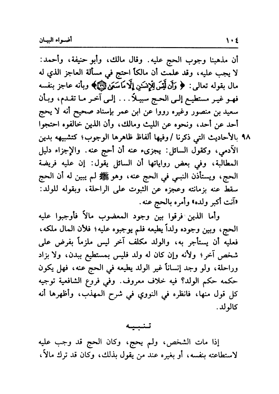 أن مذهبنا وجوب الحج عليه. وقال مالك، وأبو حنيفة، وأحمد: لا يجب عليه، وقد علمت أن مالكًا احتج في مسألة العاجز الذي له مال بقوله تعالى: {وَأَنْ لَيسَ لِلْإِنْسَانِ إلا مَا سَعَى (٣٩)} وبأنه عاجز بنفسه فهو غير مستطيع إلى الحج سبيلًا ... إلى آخر ما تقدم، وبأن سعيد بن منصور وغيره رووا عن ابن عمر بإسناد صحيح أنه لا يحج أحد عن أحد، ونحوه عن الليث ومالك، وأن الذين خالفوه احتجوا بالأحاديث التي ذكرنا وفيها ألفاظ ظاهرها الوجوب؛ كتشبيهه بدين الآدمي، وكقول السائل: يجزئ عنه أن أحج عنه. والإِجزاء دليل المطالبة، وفي بعض رواياتها أن السائل يقول: إن عليه فريضة الحج، ويستأذن النبي في الحج عنه، وهو - صلى الله عليه وسلم - لم يبين له أن الحج سقط عنه بزمانته وعجزه عن الثبوت على الراحلة، وبقوله للولد: "آنت أكبر ولده" وأمره بالحج عنه.