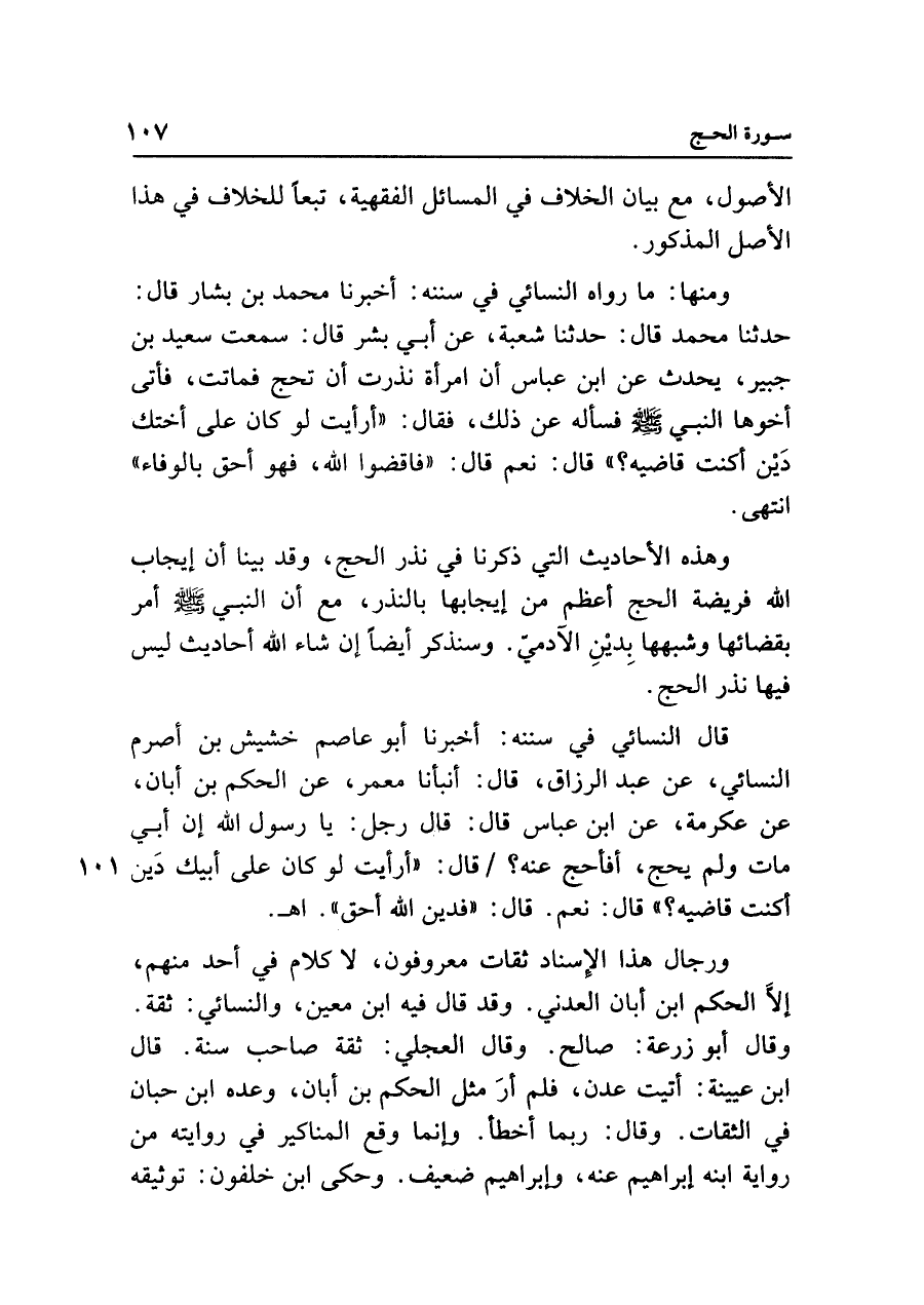 ومنها: ما رواه النسائي في سننه: أخبرنا محمد بن بشار قال: حدثنا محمد قال: حدثنا شعبة، عن أبي بشر قال: سمعت سعيد بن جبير، يحدث عن ابن عباس أن امرأة نذرت أن تحج فماتت، فأتى أخوها النبي - صلى الله عليه وسلم - فسأله عن ذلك، فقال: "أرأيت لو كان على أختك دَيْن أكنت قاضيه؟ " قال: نعم قال: "فاقضوا الله، فهو أحق بالوفاء" انتهى.