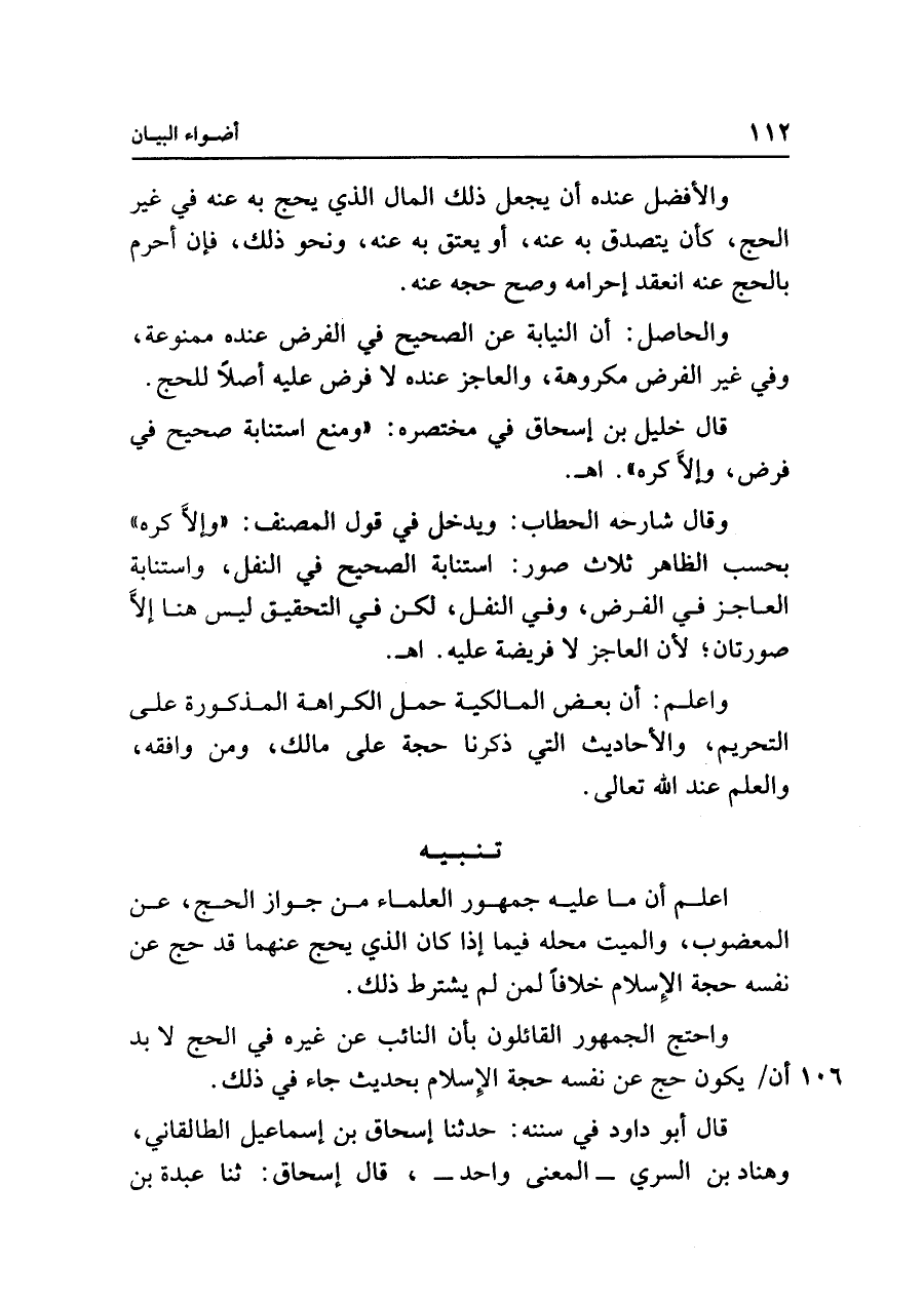 وقال شارحه الحطاب: ويدخل في قول المصنف: "وإلَّا كره" بحسب الظاهر ثلاث صور: استنابة الصحيح في النفل، واستنابة العاجز في الفرض، وفي النفل، لكن في التحقيق ليس هنا إلَّا صورتان؛ لأن العاجز لا فريضة عليه. اهـ.