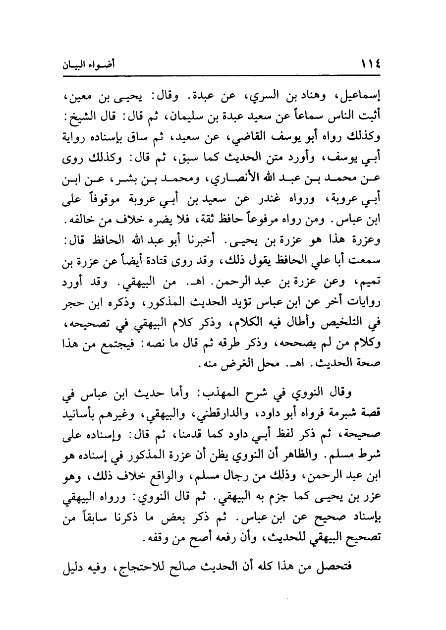 إسماعيل، وهناد بن السري، عن عبدة. وقال: يحيى بن معين، أثبت الناس سماعًا عن سعيد عبدة بن سليمان، ثم قال: قال الشيخ: وكذلك رواه أبو يوسف القاضي، عن سعيد، ثم ساق بإسناده رواية أبي يوسف، وأورد متن الحديث كما سبق، ثم قال: وكذلك روى عن محمد بن عبد الله الأنصاري، ومحمد بن بشر، عن ابن أبي عروبة، ورواه غندر عن سعيد بن أبي عروبة موقوفًا على ابن عباس. ومن رواه مرفوعًا حافظ ثقة، فلا يضره خلاف من خالفه. وعزرة هذا هو عزرة بن يحيى. أخبرنا أبو عبد الله الحافظ قال: سمعت أبا علي الحافظ يقول ذلك، وقد روى قتادة أيضًا عن عزرة بن تميم، وعن عزرة بن عبد الرحمن. اهـ. من البيهقي. وقد أورد روايات أخر عن ابن عباس تؤيد الحديث المذكور، وذكره ابن حجر في التلخيص وأطال فيه الكلام، وذكر كلام البيهقي في تصحيحه، وكلام من لم يصححه، وذكر طرقه ثم قال ما نصه: فيجتمع من هذا صحة الحديث. اهـ. محل الغرض منه.