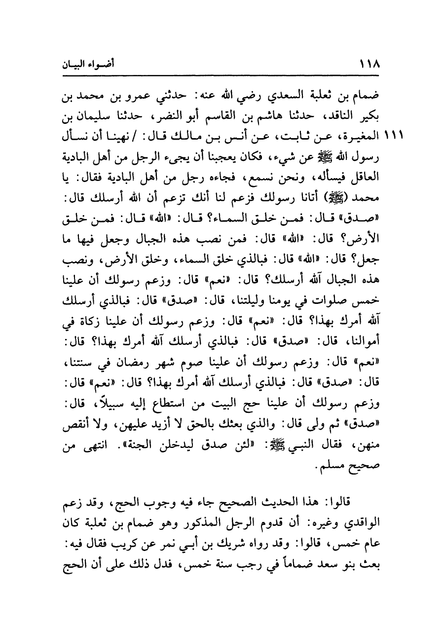 قالوا: هذا الحديث الصحيح جاء فيه وجوب الحج، وقد زعم الواقدي وغيره: أن قدوم الرجل المذكور وهو ضمام بن ثعلبة كان عام خمس، قالوا: وقد رواه شريك بن أبي نمر عن كريب فقال فيه: بعث بنو سعد ضمامًا في رجب سنة خمس، فدل ذلك على أن الحج
