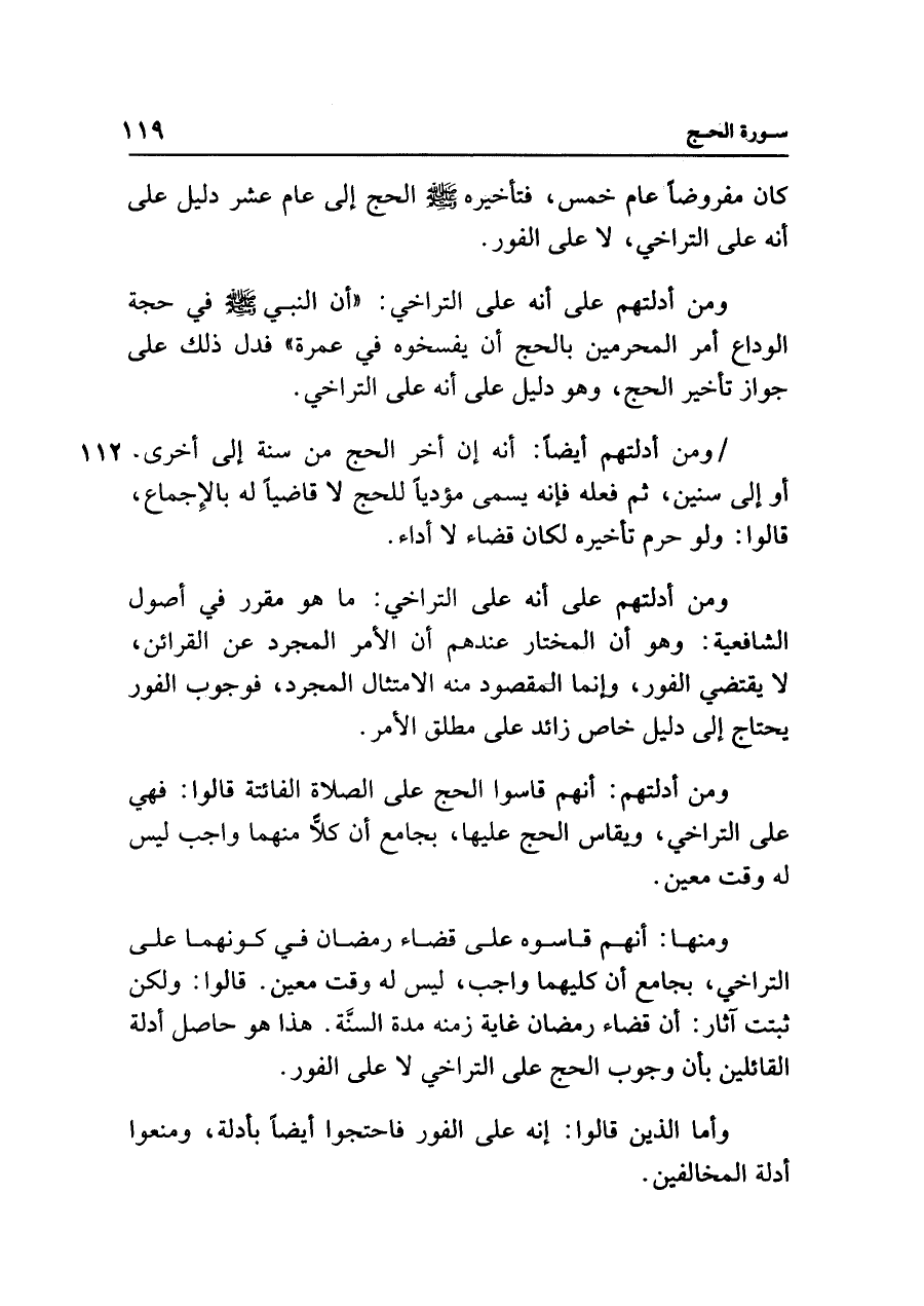 ومنها: أنهم قاسوه على قضاء رمضان في كونهما على التراخي، بجامع أن كليهما واجب، ليس له وقت معين. قالوا: ولكن ثبتت آثار: أن قضاء رمضان غاية زمنه مدة السنَّة. هذا هو حاصل أدلة القائلين بأن وجوب الحج على التراخي لا على الفور.