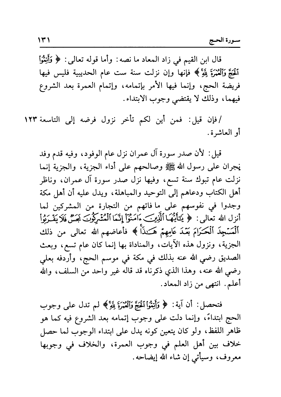 قال ابن القيم في زاد المعاد ما نصه: وأما قوله تعالى: {وَأَتِمُّوا الْحَجَّ وَالْعُمْرَةَ لِلَّهِ} فإنها وإن نزلت سنة ست عام الحديبية فليس فيها فريضة الحج، وإنما فيها الأمر بإتمامه، وإتمام العمرة بعد الشروع فيهما، وذلك لا يقتضي وجوب الابتداء.