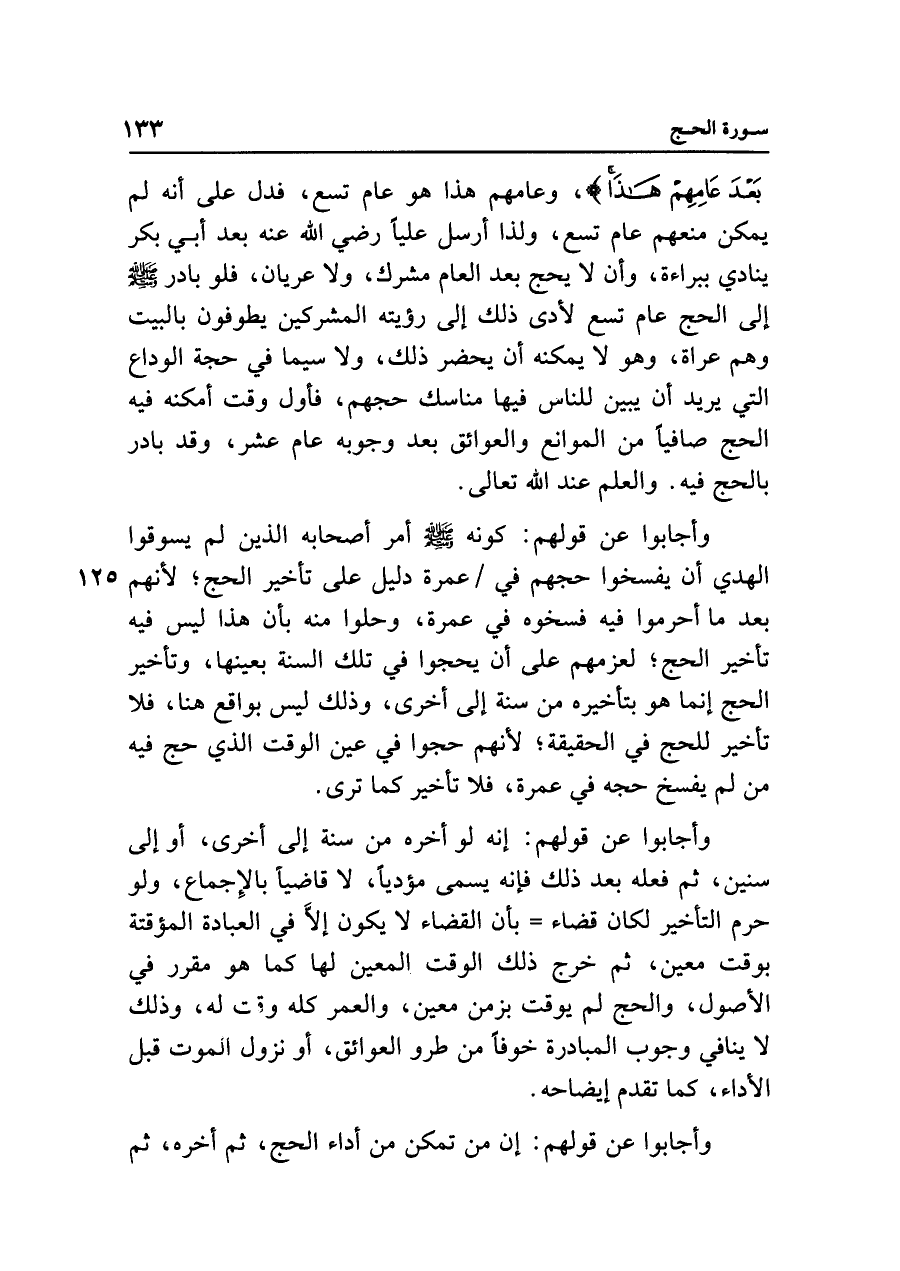 وأجابوا عن قولهم: كونه - صلى الله عليه وسلم - أمر أصحابه الذين لم يسوقوا الهدي أن يفسخوا حجهم في عمرة دليل على تأخير الحج؛ لأنهم بعد ما أحرموا فيه فسخوه في عمرة، وحلوا منه بأن هذا ليس فيه تأخير الحج؛ لعزمهم على أن يحجوا في تلك السنة بعينها، وتأخير الحج إنما هو بتأخيره من سنة إلى أخرى، وذلك ليس بواقع هنا، فلا تأخير للحج في الحقيقة؛ لأنهم حجوا في عين الوقت الذي حج فيه من لم يفسخ حجه في عمرة، فلا تأخير كما ترى.
