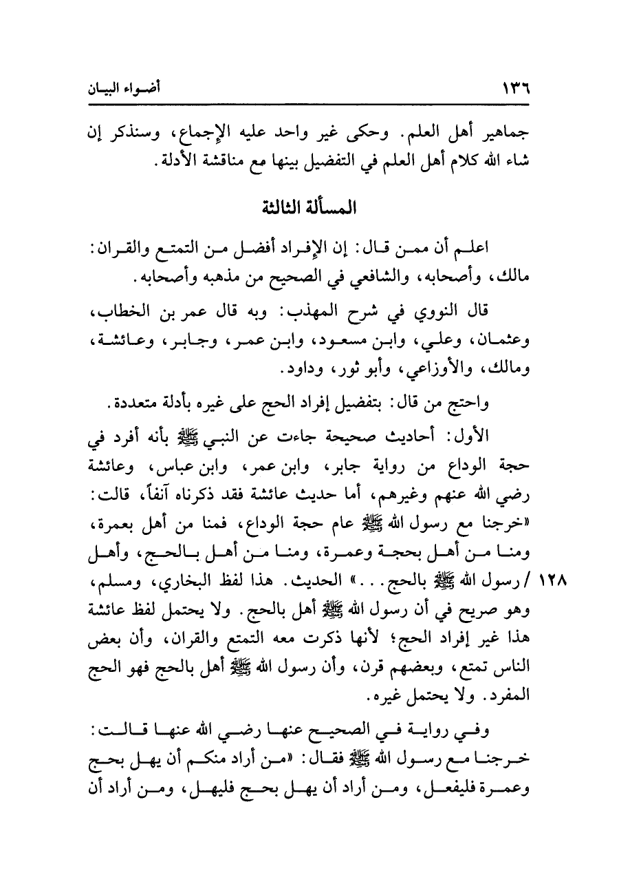 اعلم أن ممن قال: إن الإِفراد أفضل من التمتع والقران: مالك، وأصحابه، والشافعي في الصحيح من مذهبه وأصحابه.