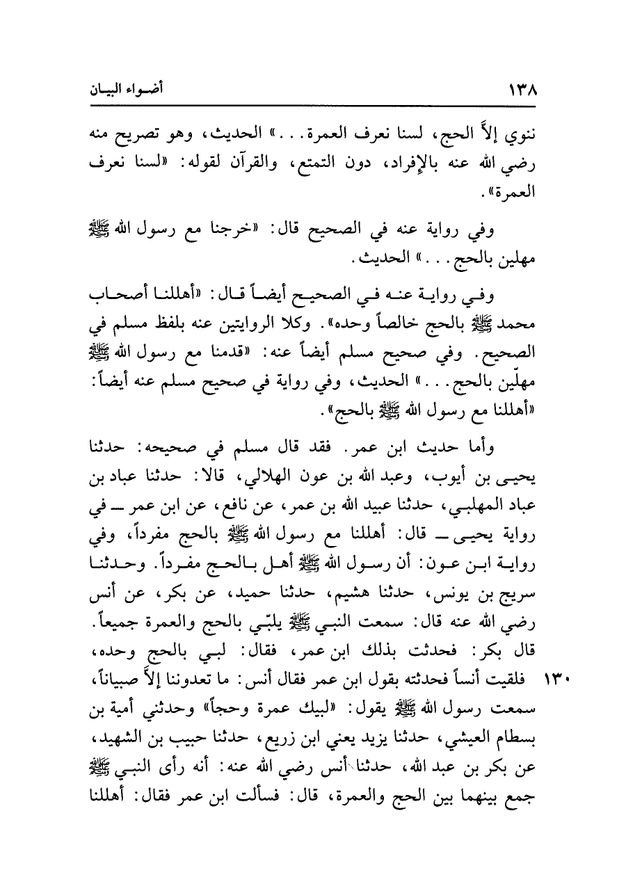 وأما حديث ابن عمر. فقد قال مسلم في صحيحه: حدثنا يحيى بن أيوب، وعبد الله بن عون الهلالي، قالا: حدثنا عباد بن عباد المهلبي، حدثنا عبيد الله بن عمر، عن نافع، عن ابن عمر - في رواية يحيى - قال: أهللنا مع رسول الله - صلى الله عليه وسلم - بالحج مفردًا، وفي رواية ابن عون: أن رسول الله - صلى الله عليه وسلم - أهل بالحج مفردًا. وحدثنا سريج بن يونس، حدثنا هشيم، حدثنا حميد، عن بكر، عن أنس - رضي الله عنه - قال: سمعت النبي - صلى الله عليه وسلم - يلبّي بالحج والعمرة جميعًا. قال بكر: فحدثت بذلك ابن عمر، فقال: لبي بالحج وحده، فلقيت أنسًا فحدثته بقول ابن عمر فقال أنس: ما تعدوننا إلَّا صبيانًا، سمعت رسول الله - صلى الله عليه وسلم - يقول: "لبيك عمرة وحجًّا" وحدثني أمية بن بسطام العيشي، حدثنا يزيد يعني ابن زريع، حدثنا حبيب بن الشهيد، عن بكر بن عبد الله، حدثنا أنس - رضي الله عنه - : أنه رأى النبي - صلى الله عليه وسلم - جمع بينهما بين الحج والعمرة، قال: فسألت ابن عمر فقال: أهللنا