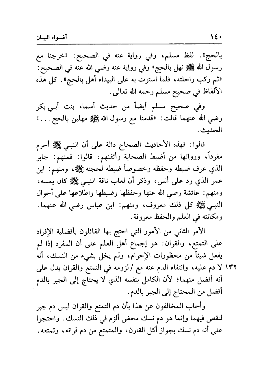قالوا: فهذه الأحاديث الصحاح دالة على أن النبي - صلى الله عليه وسلم - أحرم مفردًا، ورواتها من أضبط الصحابة وأتقنهم، قالوا: فمنهم: جابر الذي عرف ضبطه وحفظه وخصوصًا ضبطه لحجته - صلى الله عليه وسلم - ، ومنهم: ابن عمر الذي رد على أنس، وذكر أن لعاب ناقة النبي - صلى الله عليه وسلم - كان يمسه، ومنهم: عائشة - رضي الله عنهما - وحفظها وضبطها واطلاعها على أحوال النبي - صلى الله عليه وسلم - كل ذلك معروف، ومنهم: ابن عباس - رضي الله عنهما - . ومكانته في العلم والحفظ معروفة.