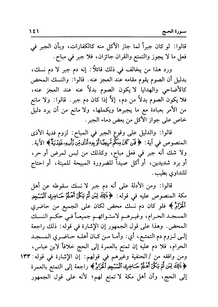 قالوا: ومن الأدلة على أنه دم جبر لا نسك سقوطه عن أهل مكة المنصوص عليه في قوله: {ذَلِكَ لِمَنْ لَمْ يَكُنْ أَهْلُهُ حَاضِرِي الْمَسْجِدِ الْحَرَامِ} فلو كان دم نسك محض لكان على الجميع من حاضري المسجد الحرام، وغيرهم لاستوائهم جميعًا في حكم النسك المحض. وهذا على قول الجمهور إن الإِشارة في قوله: ذلك راجعة إلى لزوم دم التمتع، أي: وأما من كان أهله حاضري المسجد الحرام، فلا دم عليه إن تمتع بالعمرة إلى الحج خلافًا لابن عباس، ومن وافقه من الحنفية وغيرهم في قولهم: إن الإِشارة في قوله: {ذَلِكَ لِمَنْ لَمْ يَكُنْ أَهْلُهُ حَاضِرِي الْمَسْجِدِ الْحَرَامِ} راجعة إلى التمتع بالعمرة إلى الحج، وأن أهل مكة لا تمتع لهم؛ لأنه على قول الجمهور