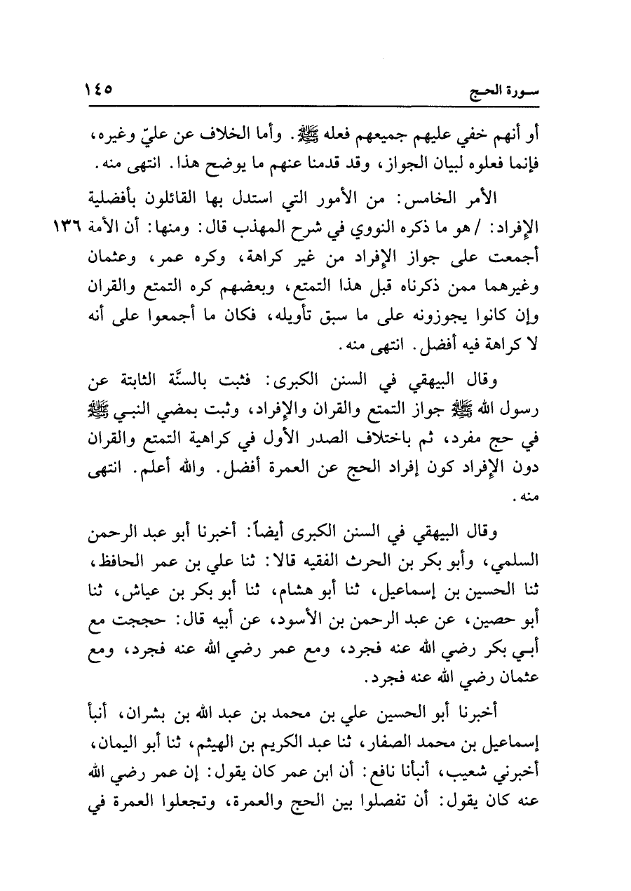 وقال البيهقي في السنن الكبرى: فثبت بالسنَّة الثابتة عن رسول الله - صلى الله عليه وسلم - جواز التمتع والقران والإِفراد، وثبت بمضي النبي - صلى الله عليه وسلم - في حج مفرد، ثم باختلاف الصدر الأول في كراهية التمتع والقران دون الإِفراد كون إفراد الحج عن العمرة أفضل. والله أعلم. انتهى منه.