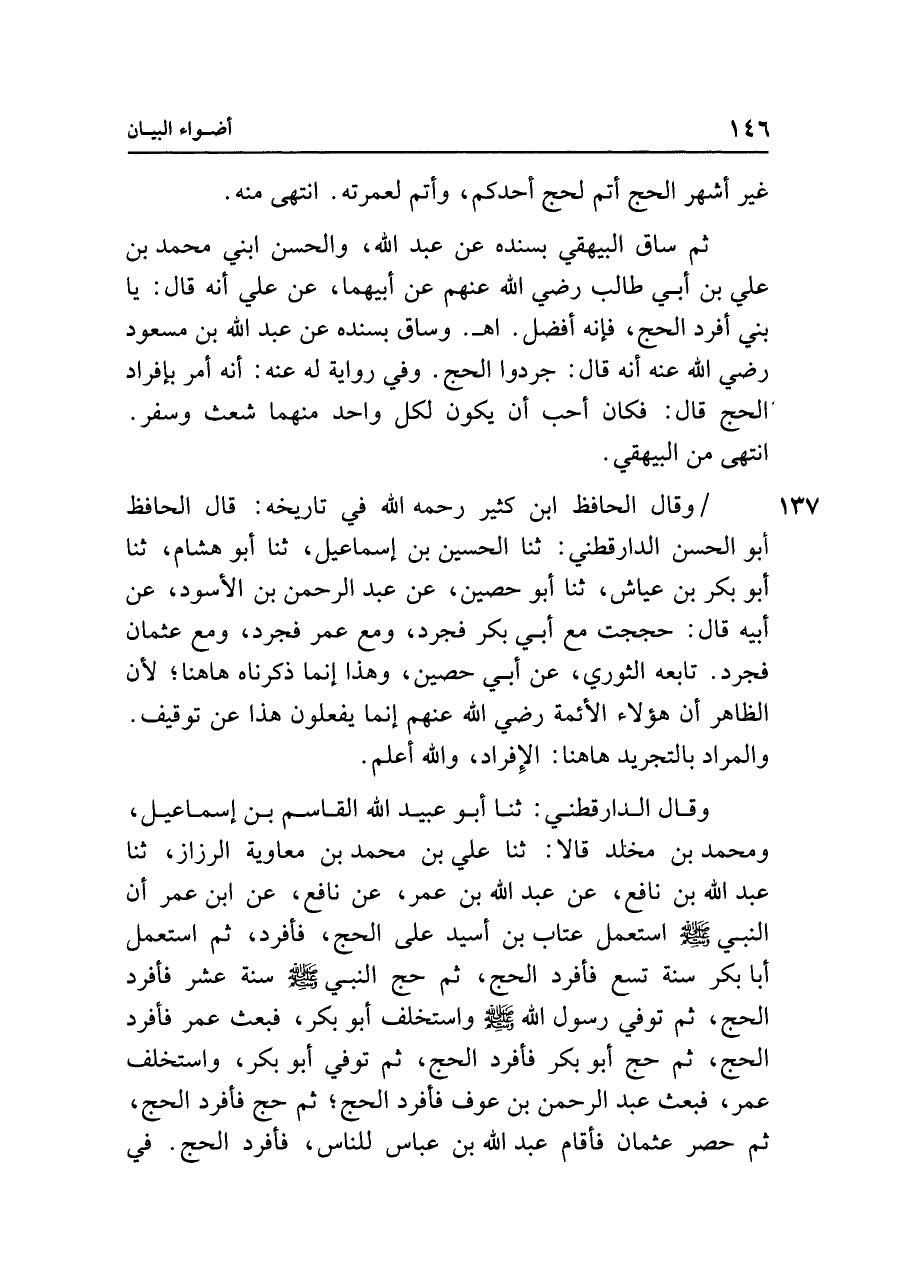 ثم ساق البيهقي بسنده عن عبد الله، والحسن ابني محمد بن علي بن أبي طالب - رضي الله عنهم - عن أبيهما، عن علي أنه قال: يا بني أفرد الحج، فإنه أفضل. اهـ. وساق بسنده عن عبد الله بن مسعود - رضي الله عنه - أنه قال: جردوا الحج. وفي رواية له عنه: أنه أمر بإفراد الحج قال: فكان أحب أن يكون لكل واحد منهما شعث وسفر. انتهى من البيهقي.