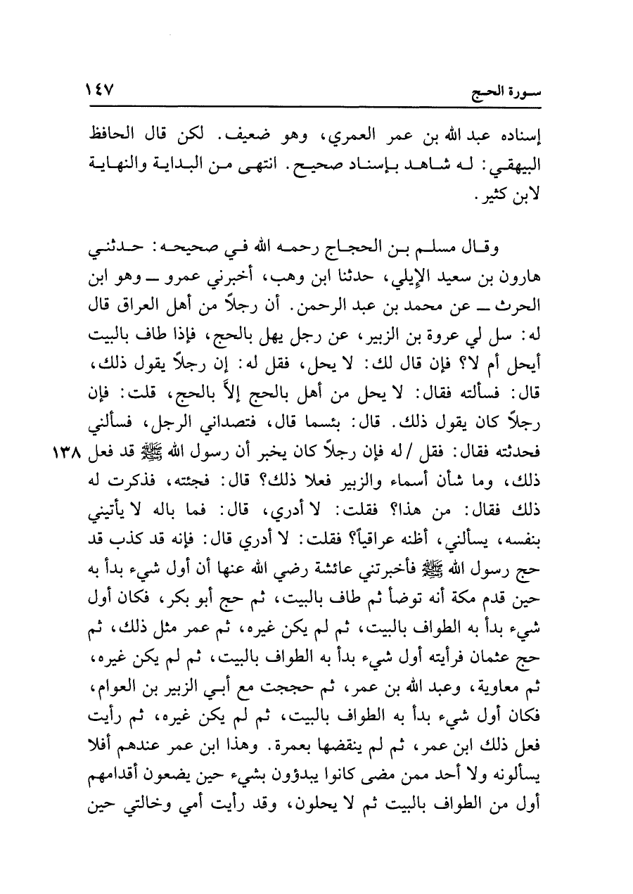 وقال مسلم بن الحجاج رحمه الله في صحيحه: حدثني هارون بن سعيد الإِيلي، حدثنا ابن وهب، أخبرني عمرو - وهو ابن الحرث - عن محمد بن عبد الرحمن. أن رجلًا من أهل العراق قال له: سل لي عروة بن الزبير، عن رجل يهل بالحج، فإذا طاف بالبيت أيحل أم لا؟ فإن قال لك: لا يحل، فقل له: إن رجلًا يقول ذلك، قال: فسألته فقال: لا يحل من أهل بالحج إلَّا بالحج، قلت: فإن رجلًا كان يقول ذلك. قال: بئسما قال، فتصداني الرجل، فسألني فحدثته فقال: فقل له فإن رجلًا كان يخبر أن رسول الله - صلى الله عليه وسلم - قد فعل ذلك، وما شأن أسماء والزبير فعلا ذلك؟ قال: فجئته، فذكرت له ذلك فقال: من هذا؟ فقلت: لا أدري، قال: فما باله لا يأتيني بنفسه، يسألني، أظنه عراقيًّا؟ فقلت: لا أدري قال: فإنه قد كذب قد حج رسول الله - صلى الله عليه وسلم - فأخبرتني عائشة - رضي الله عنها - أن أول شيء بدأ به حين قدم مكة أنه توضأ ثم طاف بالبيت، ثم حج أبو بكر، فكان أول شيء بدأبه الطواف بالبيت، ثم لم يكن غيره، ثم عمر مثل ذلك، ثم حج عثمان فرأيته أول شيء بدأ به الطواف بالبيت، ثم لم يكن غيره، ثم معاوية، وعبد الله بن عمر، ثم حججت مع أبي الزبير بن العوام، فكان أول شيء بدأ به الطواف بالبيت، ثم لم يكن غيره، ثم رأيت فعل ذلك ابن عمر، ثم لم ينقضها بعمرة. وهذا ابن عمر عندهم أفلا يسألونه ولا أحد ممن مضى كانوا يبدؤون بشيء حين يضعون أقدامهم أول من الطواف بالبيت ثم لا يحلون، وقد رأيت أمي وخالتي حين