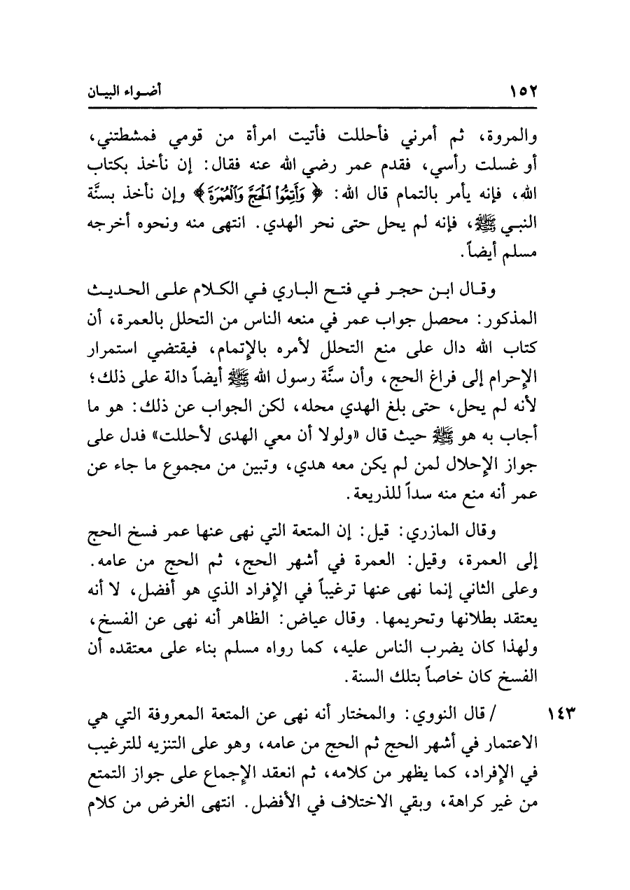 وقال ابن حجر في فتح الباري في الكلام على الحديث المذكور: محصل جواب عمر في منعه الناس من التحلل بالعمرة، أن كتاب الله دال على منع التحلل لأمره بالإتمام، فيقتضي استمرار الإِحرام إلى فراغ الحج، وأن سنَّة رسول الله - صلى الله عليه وسلم - أيضًا دالة على ذلك؛ لأنه لم يحل، حتى بلغ الهدي محله، لكن الجواب عن ذلك: هو ما أجاب به هو - صلى الله عليه وسلم - حيث قال "ولولا أن معي الهدى لأحللت" فدل على جواز الإِحلال لمن لم يكن معه هدي، وتبين من مجموع ما جاء عن عمر أنه منع منه سدًّا للذريعة.