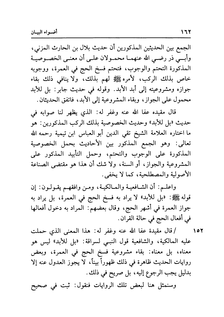 قال مقيدة عفا الله عنه وغفر له: هذا المعنى الذي حملت عليه المالكية، والشافعية قول النبي لسراقة: "بل للأبد" ليس هو معناه، بل معناه: بقاء مشروعية فسخ الحج في العمرة، وبعض روايات الحديث ظاهرة في ذلك ظهورًا بينًا، لا يجوز العدول عنه إلا بدليل يجب الرجوع إليه، بل صريح في ذلك.