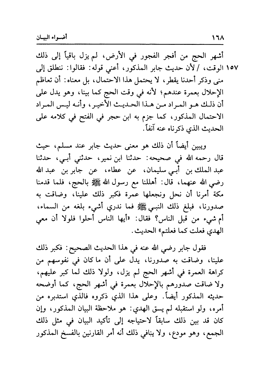 ويبين أيضًا أن ذلك هو معنى حديث جابر عند مسلم، حيث قال رحمه الله في صحيحه: حدثنا ابن نمير، حدثني أبي، حدثنا عبد الملك بن أبي سليمان، عن عطاء، عن جابر بن عبد الله رضي الله عنهما، قال: أهللنا مع رسول الله - صلى الله عليه وسلم - بالحج، فلما قدمنا مكة أمرنا أن نحل ونجعلها عمرة فكبر ذلك علينا، وضاقت به صدورنا، فبلغ ذلك النبي - صلى الله عليه وسلم - فما ندري أشيء بلغه من السماء، أم شيء من قبل الناس؟ فقال: "أيها الناس أحلوا فلولا أن معي الهدي فعلت كما فعلتم" الحديث.