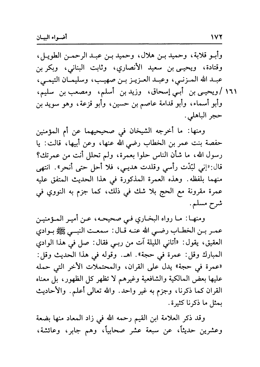ومنها: ما رواه البخاري في صحيحه، عن أمير المؤمنين عمر بن الخطاب رضي الله عنه قال: سمعت النبي - صلى الله عليه وسلم - بوادي العقيق، يقول: "أتاني الليلة آت من ربي فقال: صل في هذا الوادي المبارك وقل: عمرة في حجة". اهـ. وقوله في هذا الحديث وقل: "عمرة في حجة" يدل على القرآن، والمحتملات الأخر التي حمله عليها بعض المالكية والشافعية وغيرهم لا تظهر كل الظهور، بل معناه القرآن كما ذكرنا، وجزم به غير واحد. والله تعالى أعلم. والأحاديث بمثل ما ذكرنا كثيرة.