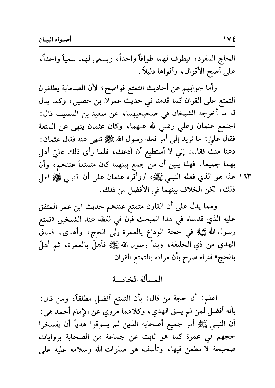 وأما جوابهم عن أحاديث التمتع فواضح؛ لأن الصحابة يطلقون التمتع على القرآن كما قدمنا في حديث عمران بن حصين، وكما يدل له ما أخرجه الشيخان في صحيحيهما، عن سعيد بن المسيب قال: اجتمع عثمان وعلي رضي الله عنهما، وكان عثمان ينهى عن المتعة فقال عليّ: ما تريد إلى أمر فعله رسول الله - صلى الله عليه وسلم - تنهى عنه فقال عثمان: دعنا منك فقال: إني لا أستطيع أن أدعك، فلما رأى ذلك عليّ أهل بهما جميعًا. فهذا يبين أن من جمع بينهما كان متمتعًا عندهم، وأن هذا هو الذي فعله النبي - صلى الله عليه وسلم - ، وأقره عثمان على أن النبي - صلى الله عليه وسلم - فعل ذلك، لكن الخلاف بينهما في الأفضل من ذلك.