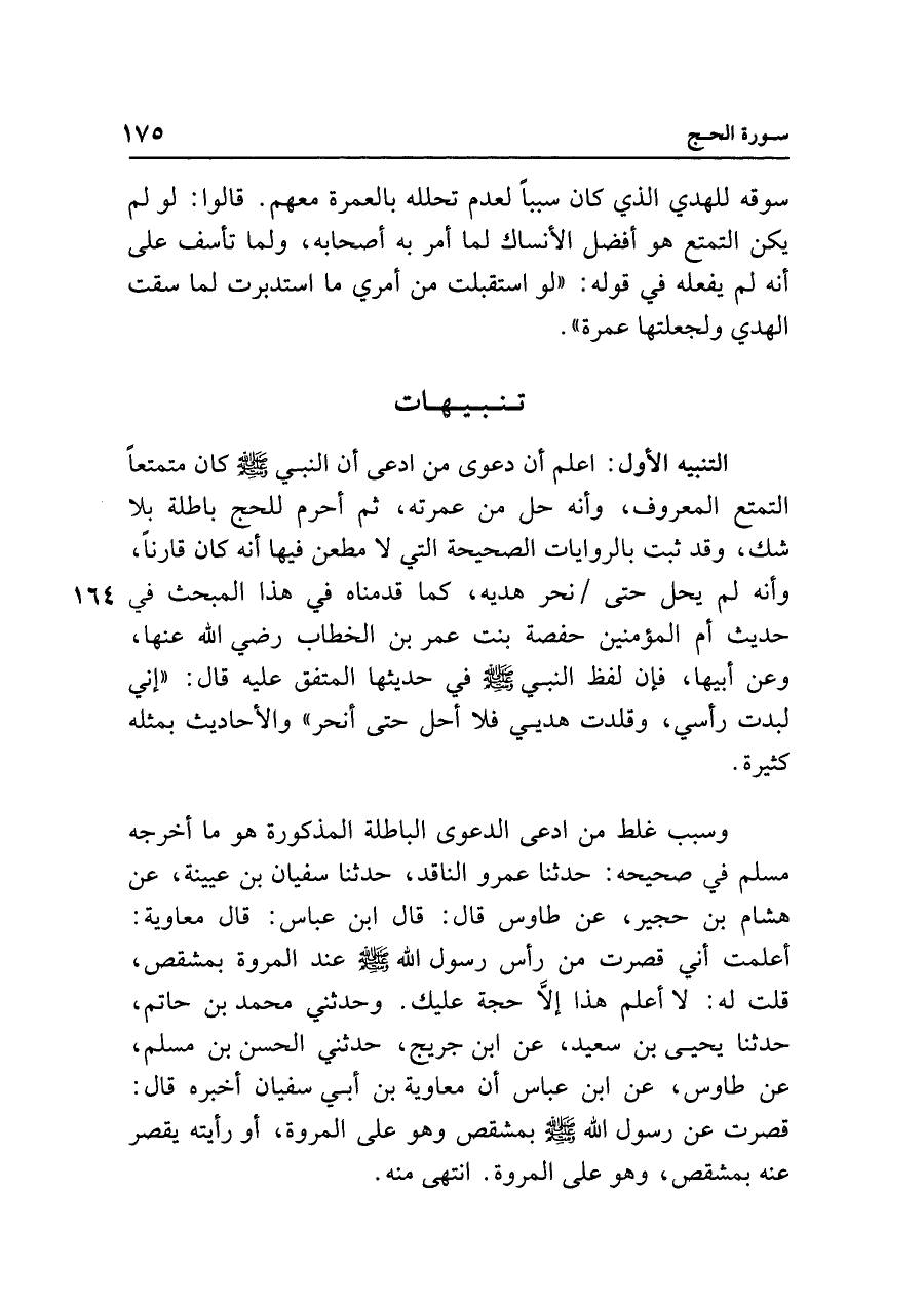 التنبيه الأول: اعلم أن دعوى من ادعى أن النبي - صلى الله عليه وسلم - كان متمتعًا التمتع المعروف، وأنه حل من عمرته، ثم أحرم للحج باطلة بلا شك، وقد ثبت بالروايات الصحيحة التي لا مطعن فيها أنه كان قارنًا، وأنه لم يحل حتى نحو هديه، كما قدمناه في هذا المبحث في حديث أم المؤمنين حفصة بنت عمر بن الخطاب رضي الله عنها، وعن أبيها، فإن لفظ النبي - صلى الله عليه وسلم - في حديثها المتفق عليه قال: "إني لبدت رأسي، وقلدت هديي فلا أحل حتى أنحو "والأحاديث بمثله كثيرة.
