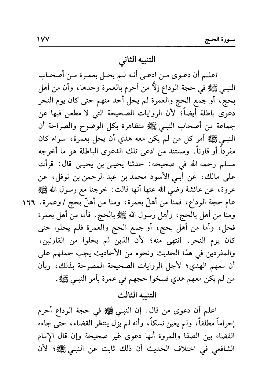 اعلم أن دعوى من ادعى أنه لم يحل بعمرة من أصحاب النبي - صلى الله عليه وسلم - حجة الوداع إلَّا من أحرم بالعمرة وحدها، وأن من أهل بحج، أو جمع الحج والعمرة لم يحل أحد منهم حتى كان يوم النحر دعوى باطلة أيضًا؛ لأن الروايات الصحيحة التي لا مطعن فيها عن جماعة من أصحاب النبي - صلى الله عليه وسلم - متظاهرة بكل الوضوح والصراحة أن النبي - صلى الله عليه وسلم - أمر كل من لم يكن معه هدي أن يحل بعمرة، سواء كان مفردًا أو قارنًا. ومستند من ادعى تلك الدعوى الباطلة هو ما أخرجه مسلم رحمه الله في صحيحه: حدثنا يحيى بن يحيى قال: قرأت على مالك، عن أبي الأسود محمد بن عبد الرحمن بن نوفل، عن عروة، عن عائشة رضي الله عنها أنها قالت: خرجنا مع رسول الله - صلى الله عليه وسلم - عام حجة الوداع، فمنا من أهلّ بعمرة، ومنا من أهلّ بحج وعمرة، ومنا من أهل بالحج، وأهل رسول الله - صلى الله عليه وسلم - بالحج. فأما من أهل بعمرة فحل، وأما من أهل بحج، أو جمع الحج والعمرة فلم يحلوا حتى كان يوم النحر. انتهى منه؛ لأن الذين لم يحلوا من القارنين، والمفردين في هذا الحديث ونحوه من الأحاديث يجب حملهم على أن معهم الهدي؛ لأجل الروايات الصحيحة المصرحة بذلك، وبأن من لم يكن معهم هدي فسخوا حجهم في عمرة بأمر النبي - صلى الله عليه وسلم - .