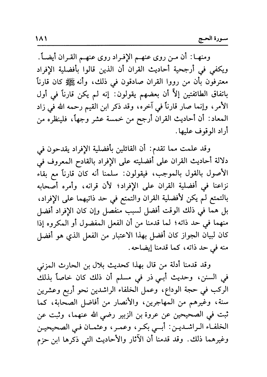 ومنها: أن من روى عنهم الإِفراد روى عنهم القرآن أيضًا. ويكفي في أرجحية أحاديث القرآن أن الذين قالوا بأفضلية الإفراد معترفون بأن من رووا القرآن صادقون في ذلك، وأنه - صلى الله عليه وسلم - كان قارنًا باتفاق الطائفتين إلَّا أن بعضهم يقولون: إنه لم يكن قارنًا في أول الأمر، وإنما صار قارنًا في آخره، وقد ذكر ابن القيم رحمه الله في زاد المعاد: أن أحاديث القرآن أرجح من خمسة عشر وجهًا، فلينظره من أراد الوقوف عليها.