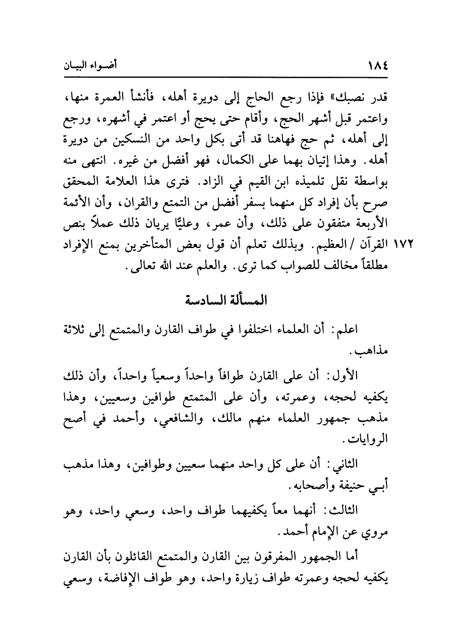 قدر نصبك" فإذا رجع الحاج إلى دويرة أهله، فأنشأ العمرة منها، واعتمر قبل أشهر الحج، وأقام حتى يحج أو اعتمر في أشهره، ورجع إلى أهله، ثم حج فهاهنا قد أتى بكل واحد من النسكين من دويرة أهله. وهذا إتيان بهما على الكمال، فهو أفضل من غيره. انتهى منه بواسطة نقل تلميذه ابن القيم في الزاد. فترى هذا العلامة المحقق صرح بأن إفراد كل منهما بسفر أفضل من التمتع والقران، وأن الأئمة الأربعة متفقون على ذلك، وأن عمر، وعليًّا يريان ذلك عملًا بنص القرآن العظيم. وبذلك تعلم أن قول بعض المتأخرين بمنع الإِفراد مطلقًا مخالف للصواب كما ترى. والعلم عند الله تعالى.