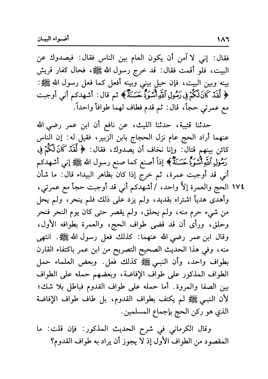 حدثنا قتيبة، حدثنا الليث، عن نافع أن ابن عمر رضي الله عنهما أراد الحج عام نزل الحجاج بابن الزبير، فقيل له: إن الناس كائن بينهم ققال: وإنا نخاف أن يصدوك، فقال: {لَقَدْ كَانَ لَكُمْ فِي رَسُولِ اللَّهِ أُسْوَةٌ حَسَنَةٌ} إذًا أصنع كما صنع رسول الله - صلى الله عليه وسلم - إني أشهدكم أني قد أوجبت عمرة، ثم خرج إذا كان بظاهر البيداء قال: ما شأن الحج والعمرة إلَّا واحد، أشهدكم أني قد أوجبت حجًّا مع عمرتي، وأهدى هديًا اشتراه بقديد، ولم يزد على ذلك فلم ينحر، ولم يحل من شيء حرم منه، ولم يحلق، ولم يقصر حتى كان يوم النحر فنحر وحلق، ورأى أن قد قضى طواف الحج، والعمرة بطوافه الأول، وقال ابن عمر رضي الله عنهما: كذلك فعل رسول الله - صلى الله عليه وسلم - . انتهى منه، وفي هذا الحديث الصحيح التصريح من ابن عمر باكتفاء القارن بطواف واحد، وأن النبي - صلى الله عليه وسلم - كذلك فعل. وبعض العلماء حمل الطواف المذكور على طواف الإِفاضة، وبعضهم حمله على الطواف بين الصفا والمروة. أما حمله على طواف القدوم فباطل بلا شك؛ لأن النبي - صلى الله عليه وسلم - لم يكتف بطواف القدوم، بل طاف طواف الإِفاضة الذي هو ركن الحج بإجماع المسلمين.