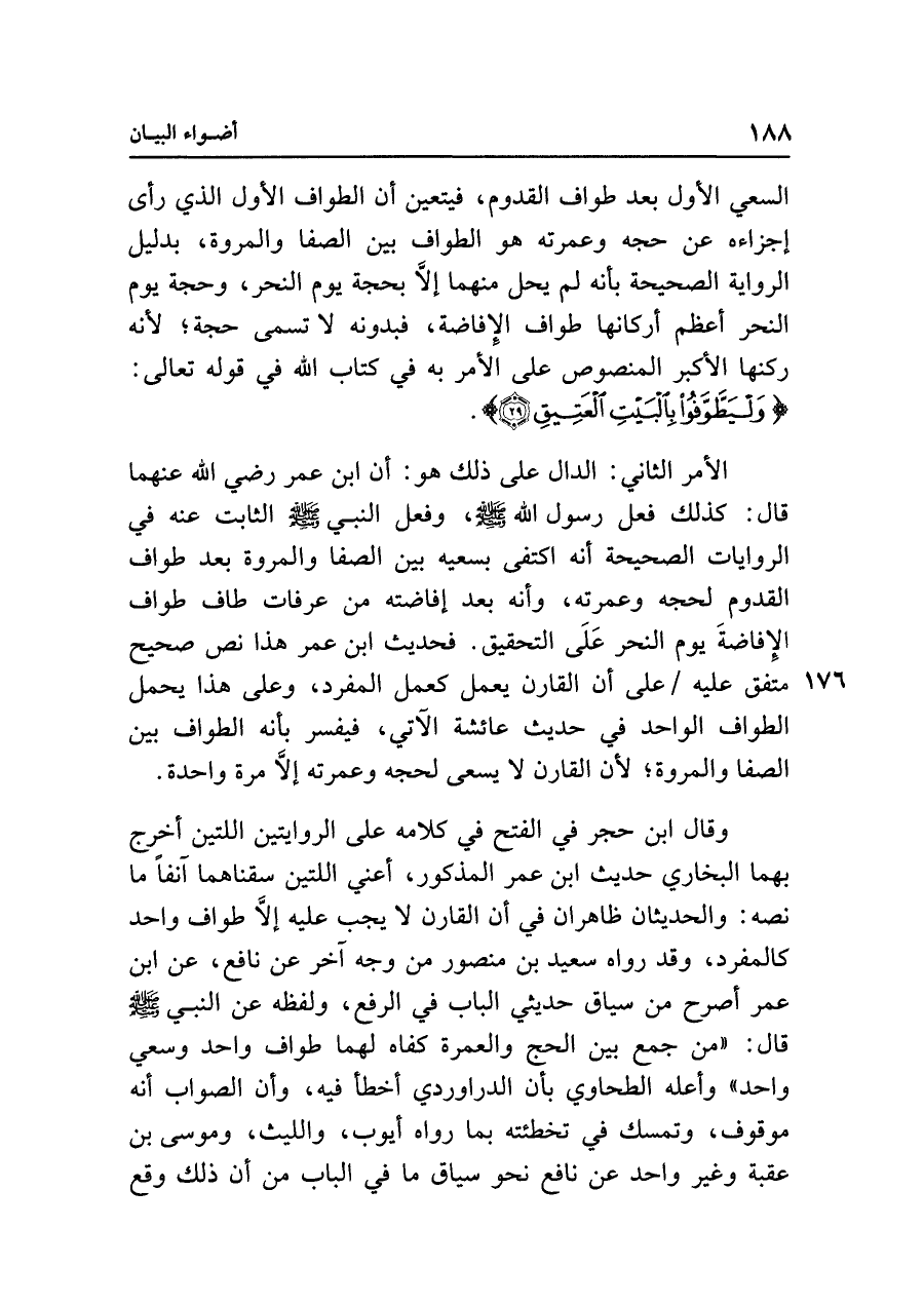 وقال ابن حجر في الفتح في كلامه على الروايتين اللتين أخرج بهما البخاري حديث ابن عمر المذكور، أعني اللتين سقناهما آنفًا ما نصه: والحديثان ظاهران في أن القارن لا يجب عليه إلَّا طواف واحد كالمفرد، وقد رواه سعيد بن منصور من وجه آخر عن نافع، عن ابن عمر أصرح من سياق حديثي الباب في الوفع، ولفظه عن النبي - صلى الله عليه وسلم - قال: "من جمع بين الحج والعمرة كفاه لهما طواف واحد وسعي واحد" وأعله الطحاوي بأن الدراوردي أخطأ فيه، وأن الصواب أنه موقوف، وتمسك في تخطئته بما رواه أيوب، والليث، وموسى بن عقبة وغير واحد عن نافع نحو سياق ما في الباب من أن ذلك وقع