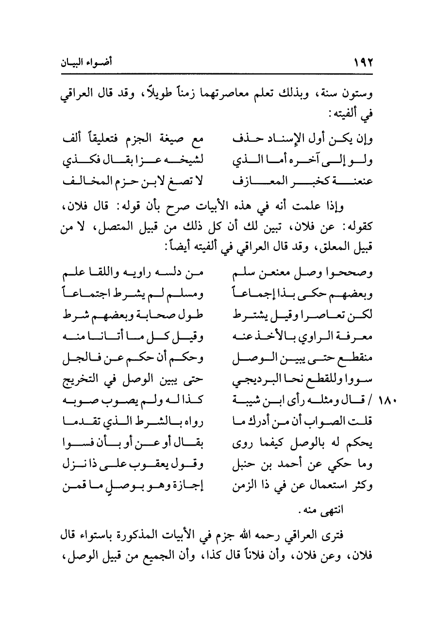 وإذا علمت أنه في هذه الأبيات صرح بأن قوله: قال فلان، كقوله: عن فلان، تبين لك أن كل ذلك من قبيل المتصل، لامن قبيل المعلق، وقد قال العراقي في ألفيته أيضًا: