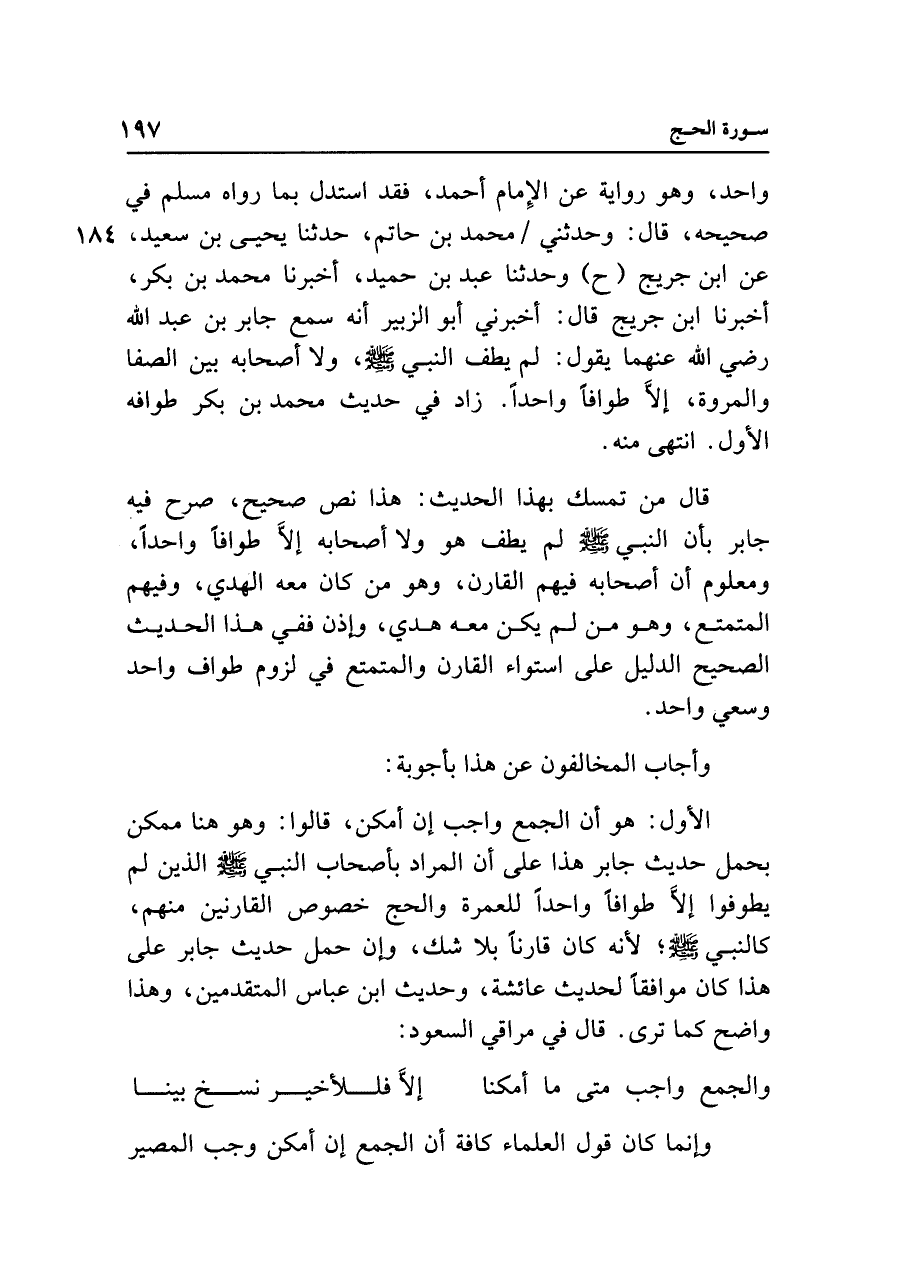 الأول: هو أن الجمع واجب إن أمكن، قالوا: وهو هنا ممكن بحمل حديث جابر هذا على أن المراد بأصحاب النبي - صلى الله عليه وسلم - الذين لم يطوفوا إلَّا طوافًا واحدًا للعمرة والحج خصوص القارنين منهم، كالنبي - صلى الله عليه وسلم - ، لأنه كان قارنًا بلا شك، وإن حمل حديث جابر على هذا كان موافقًا لحديث عائشة، وحديث ابن عباس المتقدمين، وهذا واضح كما ترى. قال في مراقي السعود:
