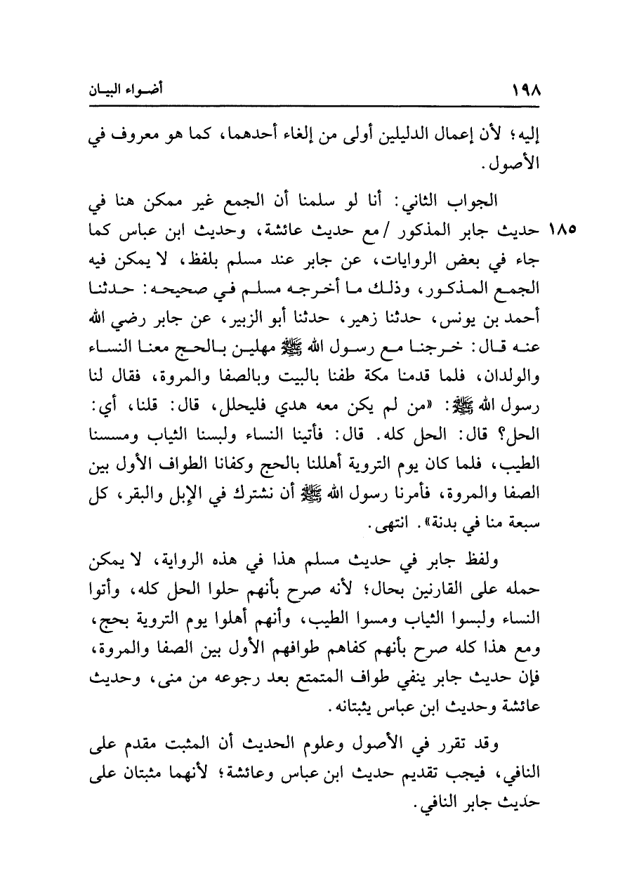 الجواب الثاني: أنا لو سلمنا أن الجمع غير ممكن هنا في حديث جابر المذكور مع حديث عائشة، وحديث ابن عبَّاس كما جاء في بعض الروايات، عن جابر عند مسلم بلفظ، لا يمكن فيه الجمع المذكور، وذلك ما أخرجه مسلم في صحيحه: حدَّثنا أحمد بن يونس، حدَّثنا زهير، حدَّثنا أَبو الزُّبَير، عن جابر رضي الله عنه قال: خرجنا مع رسول الله - صلى الله عليه وسلم - مهلين بالحج معنا النساء والولدان، فلما قدمنا مكة طفنا بالبيت وبالصفا والمروة، فقال لنا رسول الله - صلى الله عليه وسلم - : "من لم يكن معه هدي فليحلل، قال: قلنا، أي: الحل؟ قال: الحل كله. قال: فأتينا النساء ولبسنا الثياب ومسسنا الطيب، فلما كان يوم التروية أهللنا بالحج وكفانا الطواف الأول بين الصفا والمروة، فأمرنا رسول الله - صلى الله عليه وسلم - أن نشترك في الإِبل والبقر، كل سبعة منا في بدنة". انتهى.