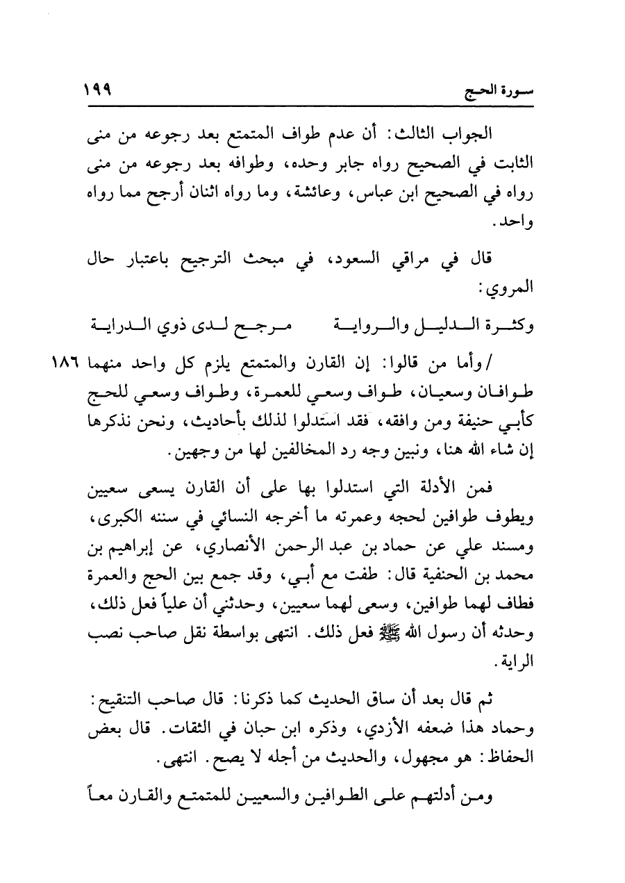 الجواب الثالث: أن عدم طواف المتمتع بعد رجوعه من منى الثابت في الصحيح رواه جابر وحده، وطوافه بعد رجوعه من منى رواه في الصحيح ابن عبَّاس، وعائشة، وما رواه اثنان أرجح مما رواه واحد.