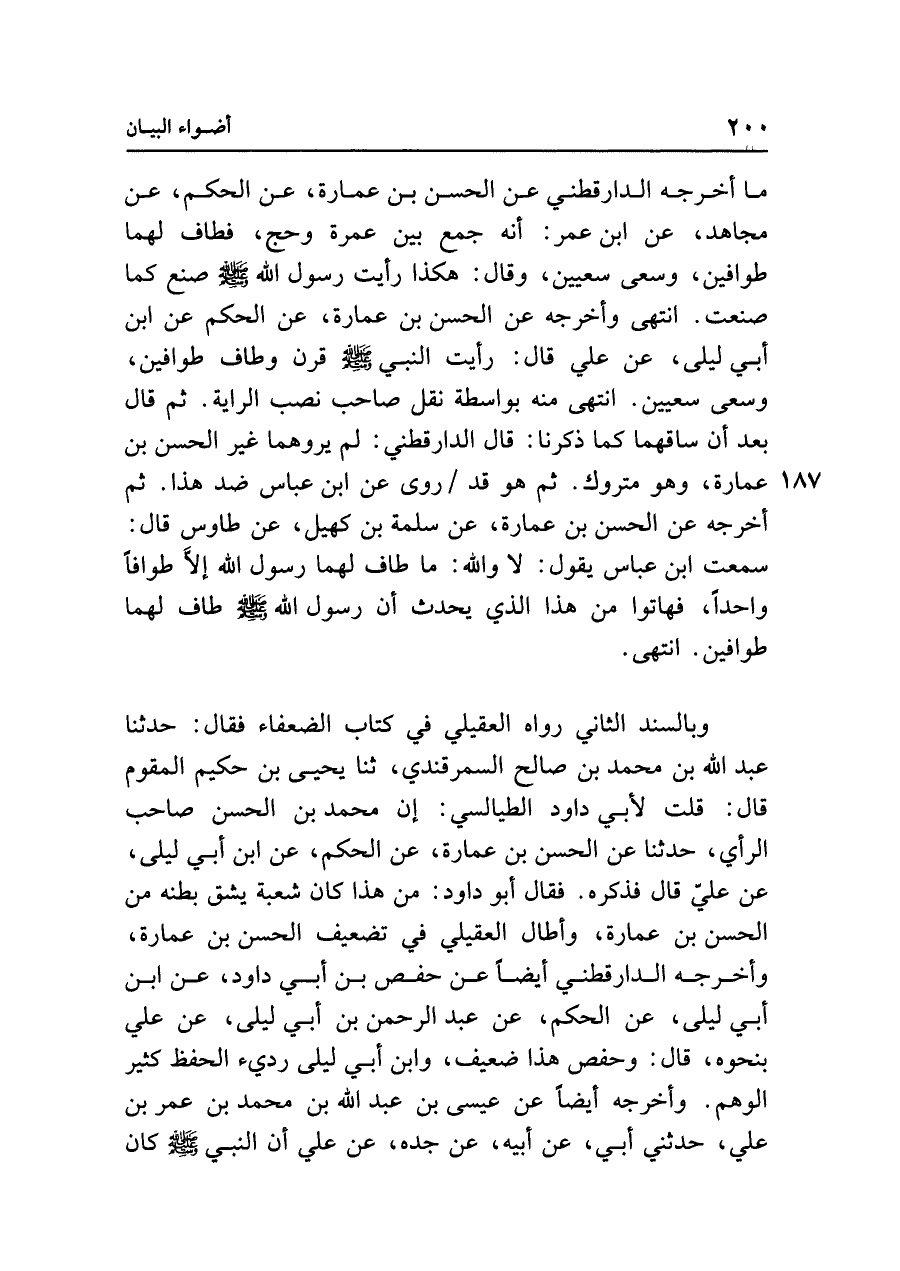 وبالسند الثاني رواه العقيلي في كتاب الضعفاء فقال: حدَّثنا عبد الله بن محمد بن صالح السمرقندي، ثنا يحيى بن حكيم المقوم قال: قلت لأبي داود الطيالسي: إن محمد بن الحسن صاحب الرأي، حدَّثنا عن الحسن بن عمارة، عن الحكم، عن ابن أبي ليلى، عن عليّ قال فذكره. فقال أَبو داود: من هذا كان شعبة يشق بطنه من الحسن بن عمارة، وأطال العقيلي في تضعيف الحسن بن عمارة، وأخرجه الدَّارَقُطني أيضًا عن حفص بن أبي داود، عن ابن أبي ليلى، عن الحكم، عن عبد الرحمن بن أبي ليلى، عن علي بنحوه، قال: وحفص هذا ضعيف، وابن أبي ليلى رديء الحفظ كثير الوهم. وأخرجه أيضًا عن عيسى بن عبد الله بن محمد بن عمر بن علي، حدثني أبي، عن أبيه، عن جده، عن علي أن النبي - صلى الله عليه وسلم - كان