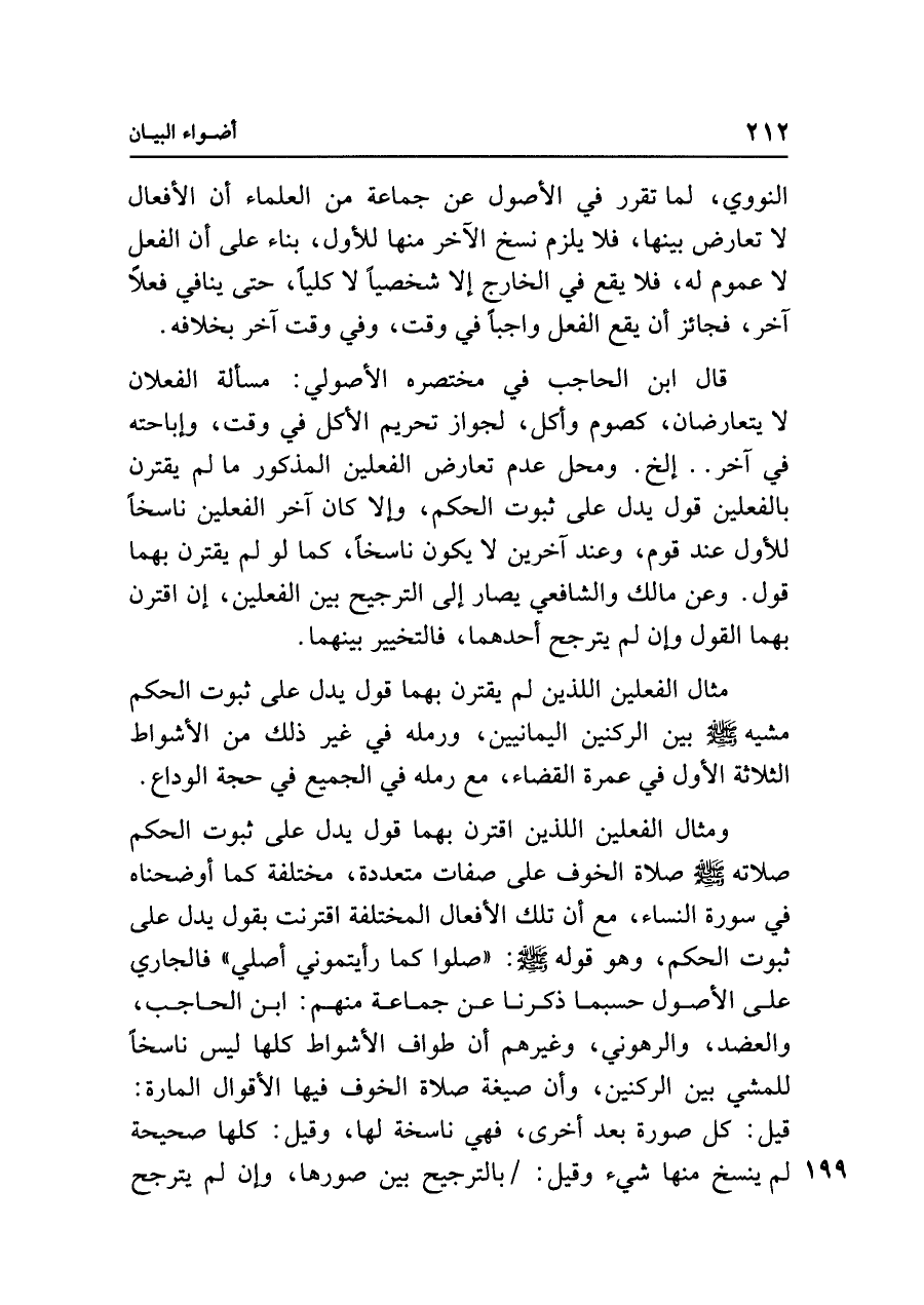 ومثال الفعلين اللذين اقترن بهما قول يدل على ثبوت الحكم صلاته - صلى الله عليه وسلم - صلاة الخوف على صفات متعددة، مختلفة كما أوضحناه في سورة النساء، مع أن تلك الأفعال المختلفة اقترنت بقول يدل على ثبوت الحكم، وهو قوله - صلى الله عليه وسلم -: "صلوا كما رأيتموني أصلي" فالجاري على الأصول حسبما ذكرنا عن جماعة منهم: ابن الحاجب، والعضد، والرهوني، وغيرهم أن طواف الأشواط كلها ليس ناسخًا للمشي بين الركنين، وأن صيغة صلاة الخوف فيها الأقوال المارة: قيل: كل صورة بعد أخرى، فهي ناسخة لها، وقيل: كلها صحيحة لم ينسخ منها شيء وقيل: بالترجيح بين صورها، وإن لم يترجح