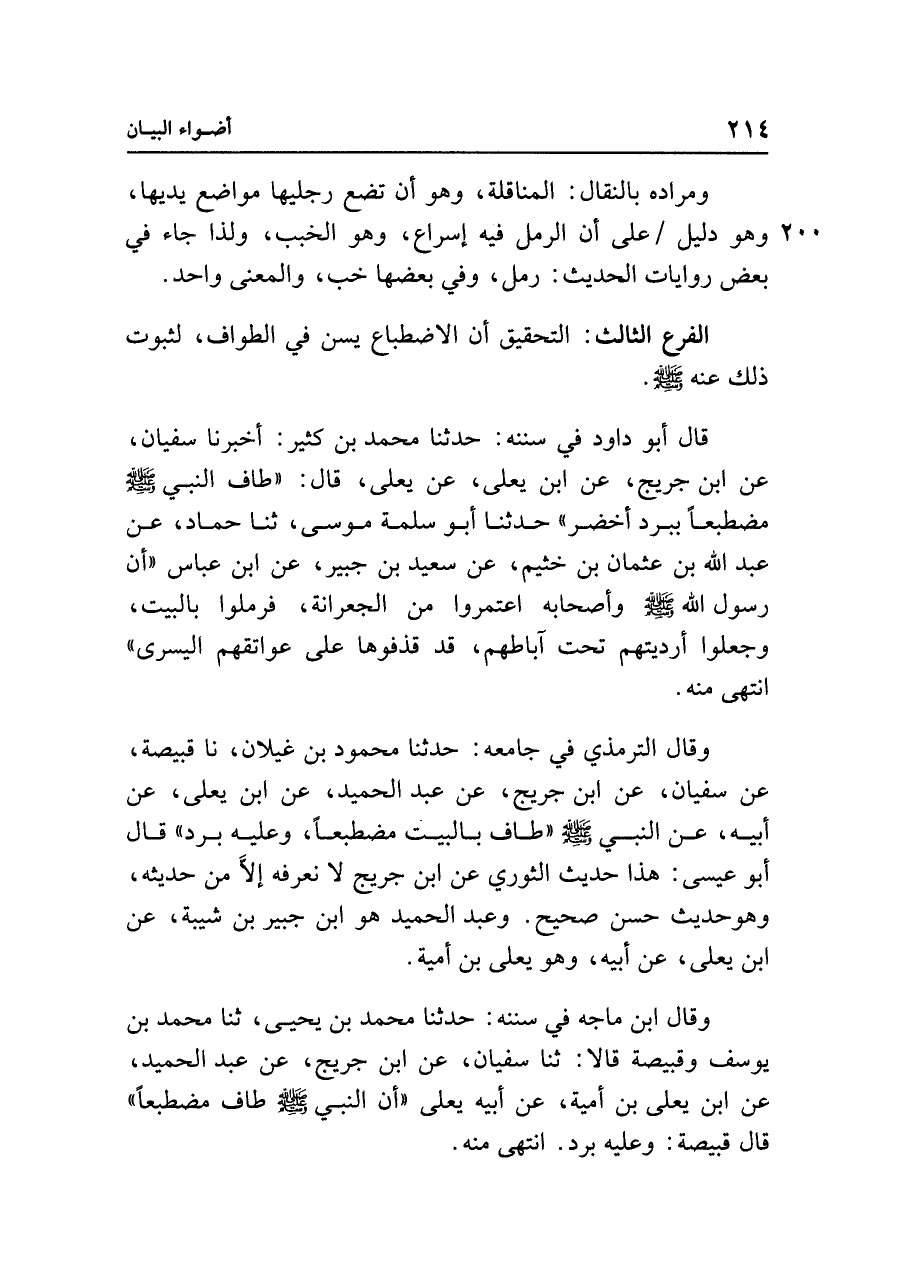الفرع الثالث: التحقيق أن الاضطباع يسن في الطواف، لثبوت ذلك عنه - صلى الله عليه وسلم - .