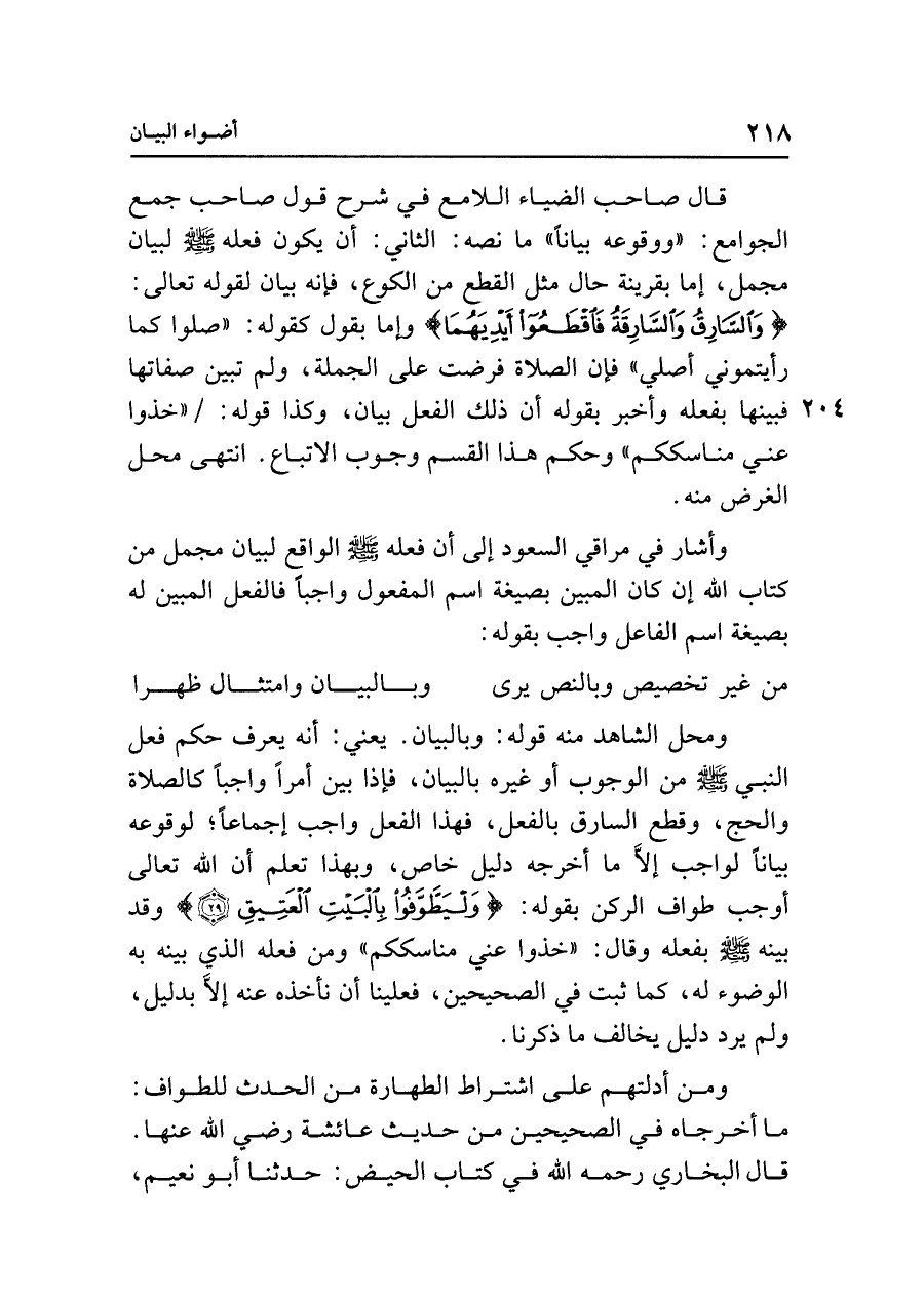 ومحل الشاهد منه قوله: وبالبيان. يعني: أنَّه يعرف حكم فعل النبي - صلى الله عليه وسلم - من الوجوب أو غيره بالبيان، فإذا بين أمرًا واجبًا كالصلاة والحج، وقطع السارق بالفعل، فهذا الفعل واجب إجماعًا؛ لوقوعه بيانًا لواجب إلَّا ما أخرجه دليل خاص، وبهذا تعلم أن الله تعالى أوجب طواف الركن بقوله: {وَلْيَطَّوَّفُوا بِالْبَيتِ الْعَتِيقِ (٢٩)} وقد بينه - صلى الله عليه وسلم - بفعله وقال: "خذوا عني مناسككم" ومن فعله الذي بينه به الوضوء له، كما ثبت في الصحيحين، فعلينا أن نأخذه عنه إلَّا بدليل، ولم يرد دليل يخالف ما ذكرنا.