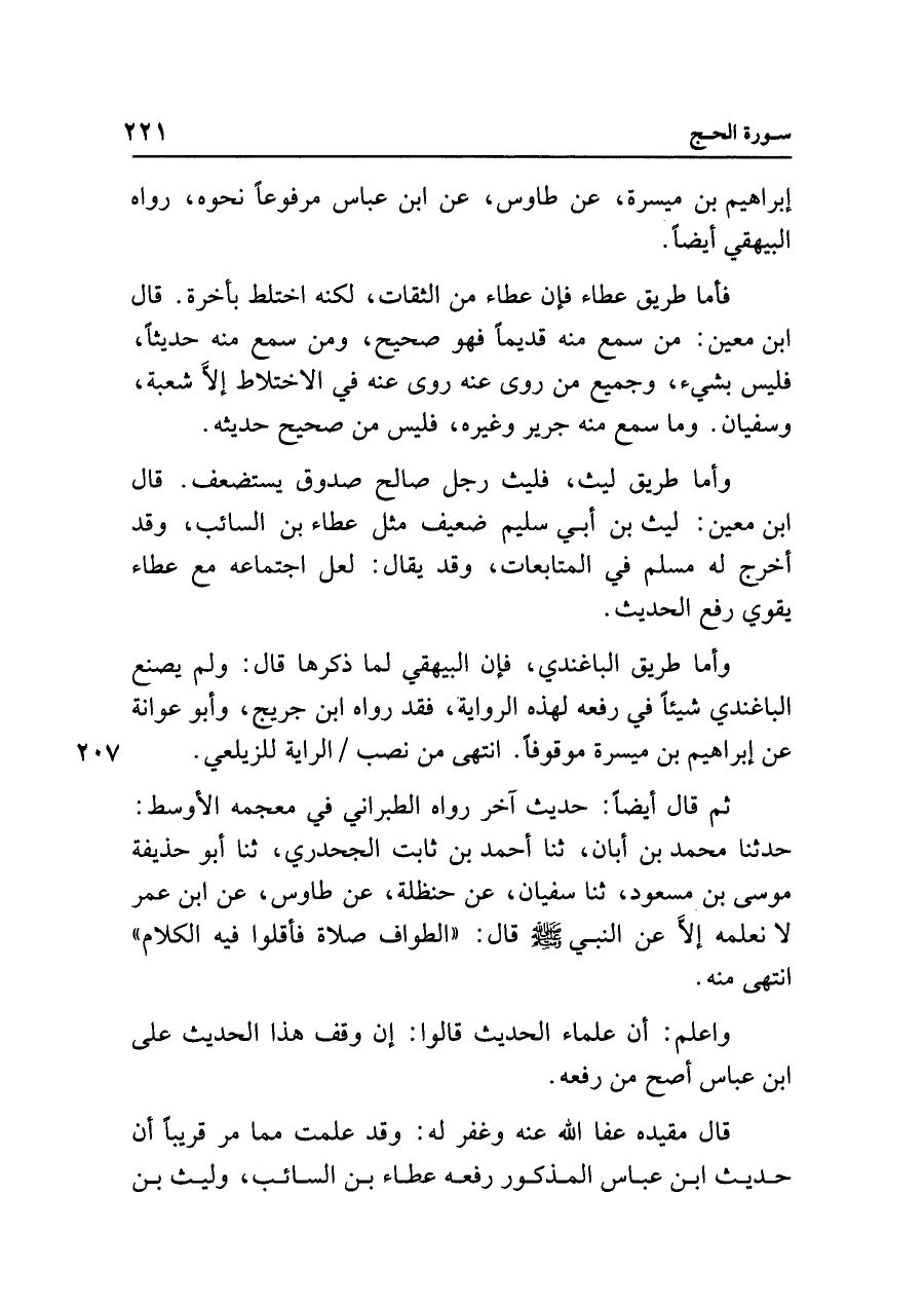 ثم قال أيضًا: حديث آخر رواه الطبراني في معجمه الأوسط: حدَّثنا محمد بن أبان، ثنا أحمد بن ثابت الجحدري، ثنا أَبو حذيفة موسى بن مسعود، ثنا سفيان، عن حنظلة، عن طاوس، عن ابن عمر لا نعلمه إلَّا عن النبي - صلى الله عليه وسلم - قال: "الطواف صلاة فأقلوا فيه الكلام" انتهى منه.