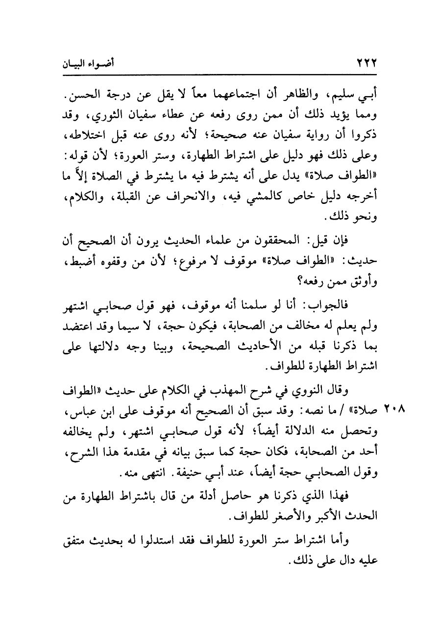 أبي سليم، والظاهر أن اجتماعهما معًا لا يقل عن درجة الحسن. ومما يؤيد ذلك أن ممن روى رفعه عن عطاء سفيان الثَّوري، وقد ذكروا أن رواية سفيان عنه صحيحة؛ لأنه روى عنه قبل اختلاطه، وعلى ذلك فهو دليل على اشتراط الطهارة، وستر العورة؛ لأن قوله: "الطواف صلاة" يدل على أنَّه يشترط فيه ما يشترط في الصلاة إلَّا ما أخرجه دليل خاص كالمشي فيه، والانحراف عن القبلة، والكلام، ونحو ذلك.