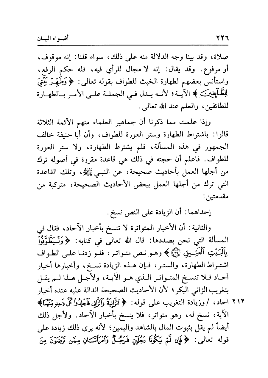 والثانية: أن الأخبار المتواترة لا تنسخ بأخبار الآحاد، فقال في المسألة التي نحن بصددها: قال الله تعالى في كتابه: {وَلْيَطَّوَّفُوا بِالْبَيتِ الْعَتِيقِ (٢٩)} وهو نص متواتر، فلو زدنا على الطواف اشتراط الطهارة، والستر، فإن هذه الزِّيادة نسخ، وأخبارها أخبار آحاد فلا تنسخ المتواتر الذي هو الآية، ولأجل هذا لم يقل بتغريب الزاني البكر، لأن الأحاديث الصحيحة الدالة عليه عنده أخبار آحاد، وزيادة التغريب على قوله: {الزَّانِيَةُ وَالزَّانِي فَاجْلِدُوا كُلَّ وَاحِدٍ مِنْهُمَا} الآية، نسخ له، وهو متواتر، فلا ينسخ بأخبار الآحاد. ولأجل ذلك أيضًا لم يقل بثبوت المال بالشاهد واليمين، لأنه يرى ذلك زيادة على قوله تعالى: {فَإِنْ لَمْ يَكُونَا رَجُلَينِ فَرَجُلٌ وَامْرَأَتَانِ مِمَّنْ تَرْضَوْنَ مِنَ
