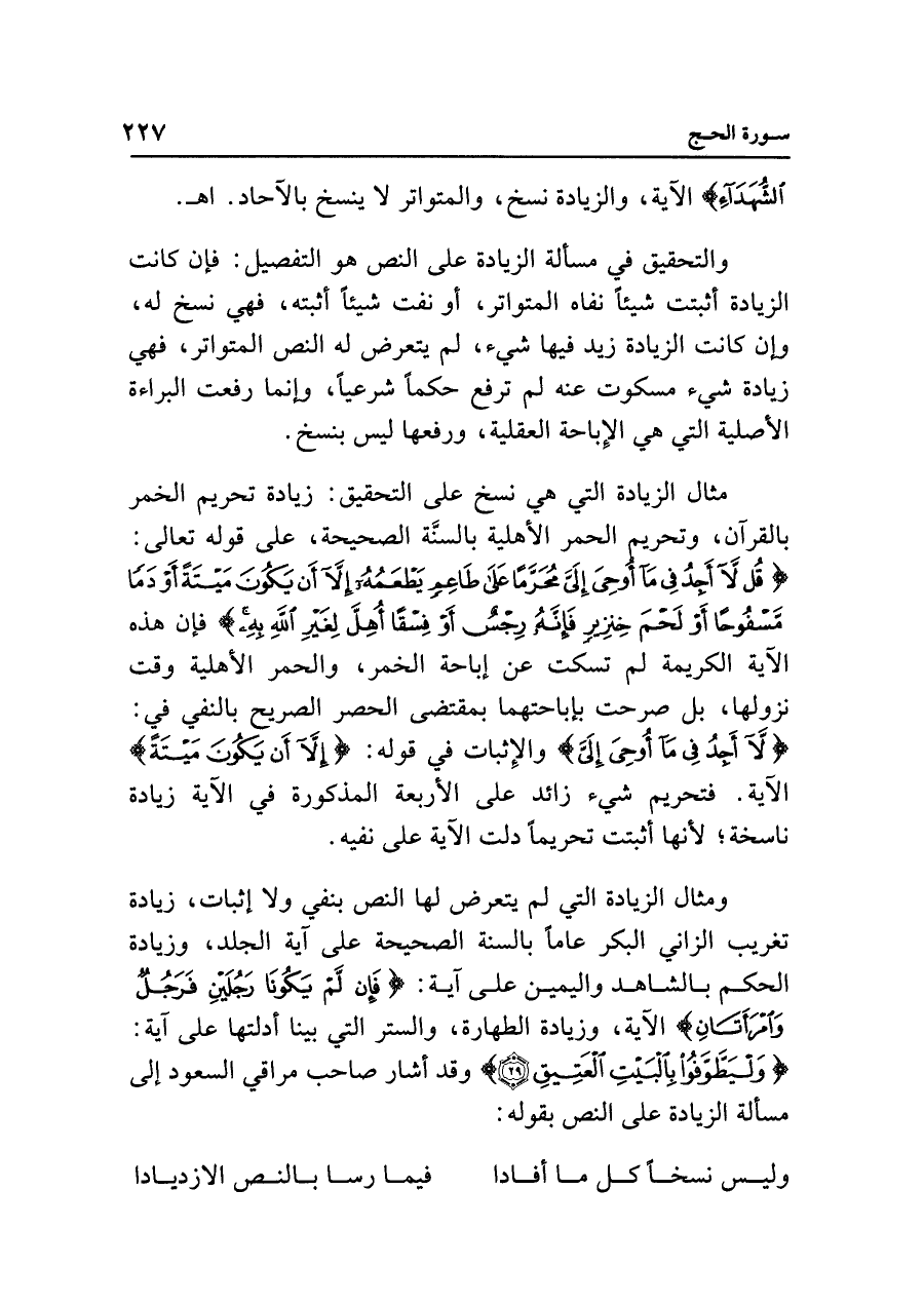 مثال الزِّيادة التي هي نسخ على التحقيق: زيادة تحريم الخمر بالقرآن، وتحريم الحمر الأهلية بالسنَّة الصحيحة، على قوله تعالى: {قُلْ لَا أَجِدُ فِي مَا أُوحِيَ إِلَيَّ مُحَرَّمًا عَلَى طَاعِمٍ يَطْعَمُهُ إلا أَنْ يَكُونَ مَيتَةً أَوْ دَمًا مَسْفُوحًا أَوْ لَحْمَ خِنْزِيرٍ فَإِنَّهُ رِجْسٌ أَوْ فِسْقًا أُهِلَّ لِغَيرِ اللَّهِ بِهِ} فإن هذه الآية الكريمة لم تسكت عن إباحة الخمر، والحمر الأهلية وقت نزولها، بل صرحت بإباحتهما بمقتضى الحصر الصريح بالنفي في: {قُلْ لَا أَجِدُ فِي مَا أُوحِيَ إِلَيَّ} والإِثبات في قوله: {إلا أَنْ يَكُونَ مَيتَةً} الآية. فتحريم شيء زائد على الأربعة المذكورة في الآية زيادة ناسخة، لأنها أثبتت تحريمًا دلت الآية على نفيه.