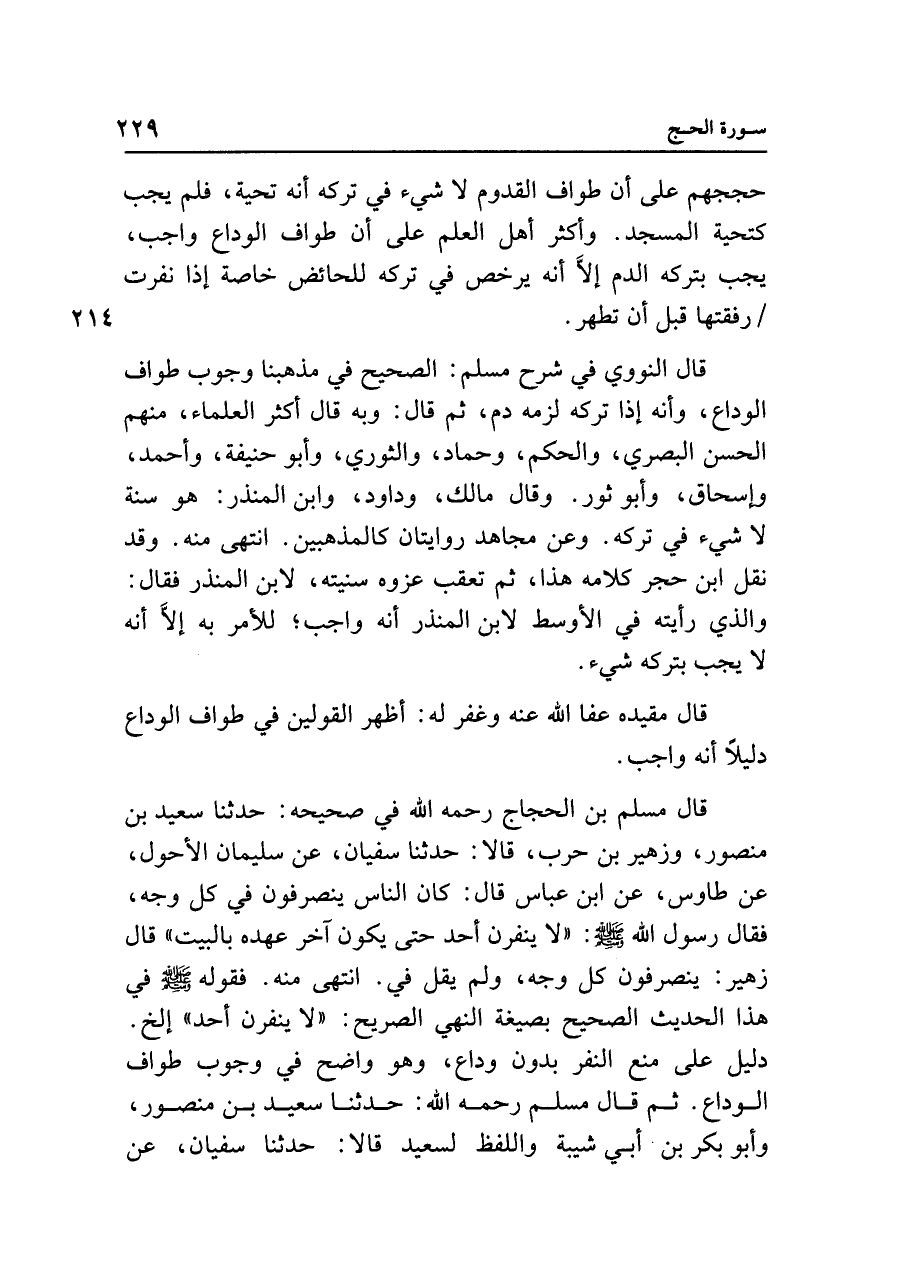 قال مسلم بن الحجاج رحمه الله في صحيحه: حدَّثنا سعيد بن منصور، وزهير بن حرب، قالا: حدَّثنا سفيان، عن سليمان الأحول، عن طاوس، عن ابن عبَّاس قال: كان الناس ينصرفون في كل وجه، فقال رسول الله - صلى الله عليه وسلم - : "لا ينفرن أحد حتَّى يكون آخر عهده بالبيت" قال زهير: ينصرفون كل وجه، ولم يقل في. انتهى منه. فقوله - صلى الله عليه وسلم - في هذا الحديث الصحيح بصيغة النهي الصريح: "لا ينفرن أحد" إلخ. دليل على منع النفر بدون وداع، وهو واضح في وجوب طواف الوداع. ثم قال مسلم رحمه الله: حدَّثنا سعيد بن منصور، وأَبو بكر بن أبي شيبة واللفظ لسعيد قالا: حدَّثنا سفيان، عن