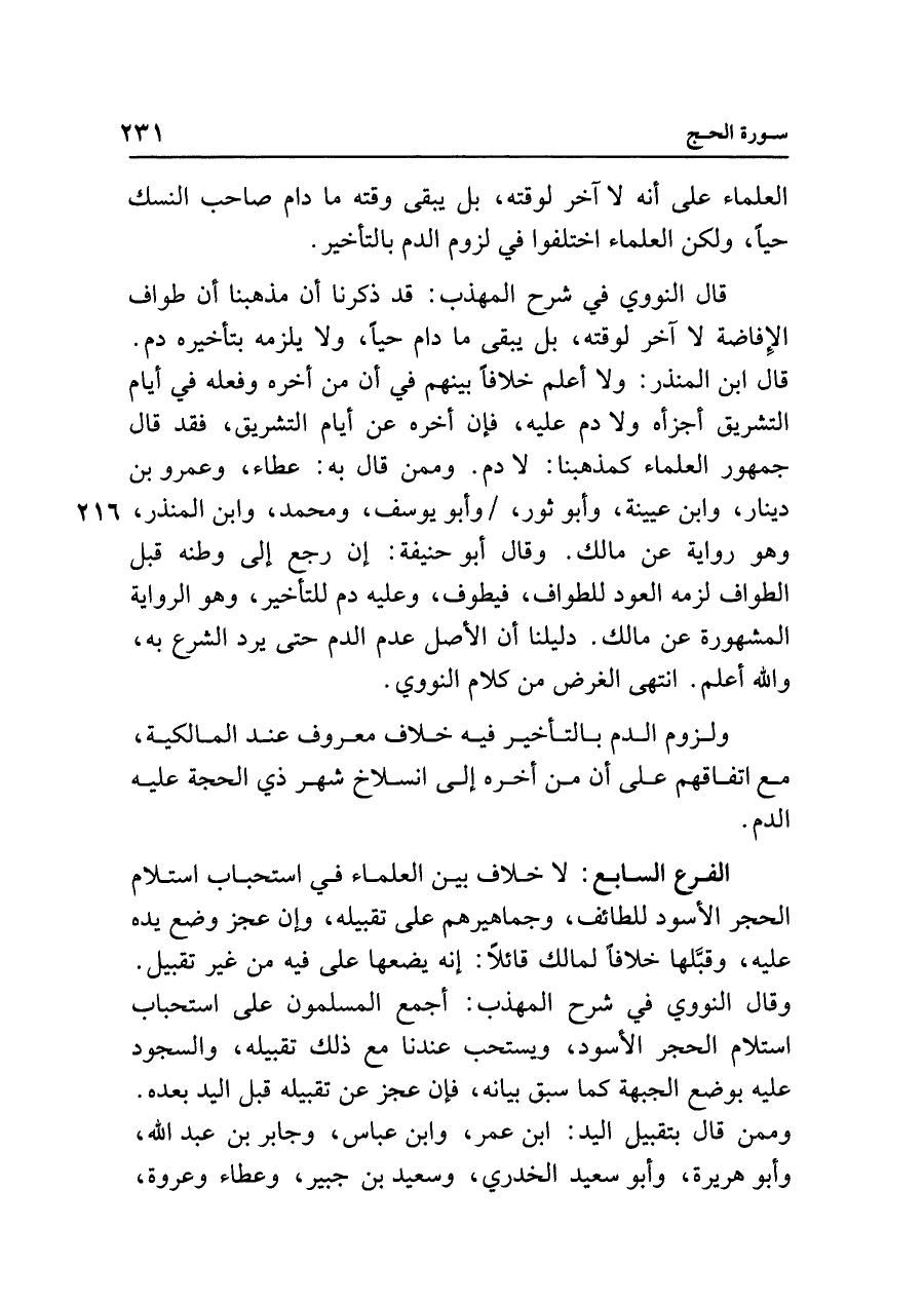 قال النووي في شرح المهذب: قد ذكرنا أن مذهبنا أن طواف الإِفاضة لا آخر لوقته، بل يبقى ما دام حيًّا، ولا يلزمه بتأخيره دم. قال ابن المنذر: ولا أعلم خلافًا بينهم في أن من آخره وفعله في أيام التشريق أجزأه ولا دم عليه، فإن آخره عن أيام التشريق، فقد قال جمهور العلماء كمذهبنا: لا دم. وممن قال به: عطاء، وعمرو بن دينار، وابن عيينة، وأَبو ثور، وأَبو يوسف، ومحمد، وابن المنذر، وهو رواية عن مالك. وقال أَبو حنيفة: إن رجع إلى وطنه قبل الطواف لزمه العود للطواف، فيطوف، وعليه دم للتأخير، وهو الرواية المشهورة عن مالك. دليلنا أن الأصل عدم الدم حتَّى يرد الشرع به، والله أعلم. انتهى الغرض من كلام النووي.
