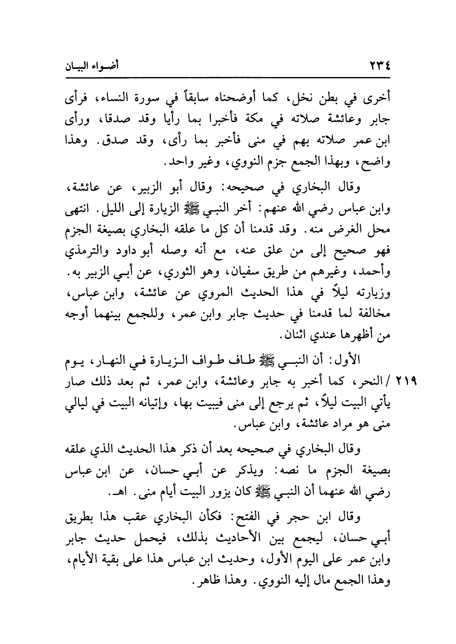 وقال البخاري في صحيحه: وقال أَبو الزُّبَير، عن عائشة، وابن عبَّاس رضي الله عنهم: أخر النبي - صلى الله عليه وسلم - الزيارة إلى الليل. انتهى محل الغرض منه. وقد قدمنا أن كل ما علقه البخاري بصيغة الجزم فهو صحيح إلى من علق عنه، مع أنَّه وصله أَبو داود والتِّرمِذي وأحمد، وغيرهم من طريق سفيان، وهو الثَّوري، عن أبي الزُّبَير به. وزيارته ليلًا في هذا الحديث المروي عن عائشة، وابن عبَّاس، مُخَالفَةُ لما قدمنا في حديث جابر وابن عمر، وللجمع بينهما أوجه من أظهرها عندي اثنان.