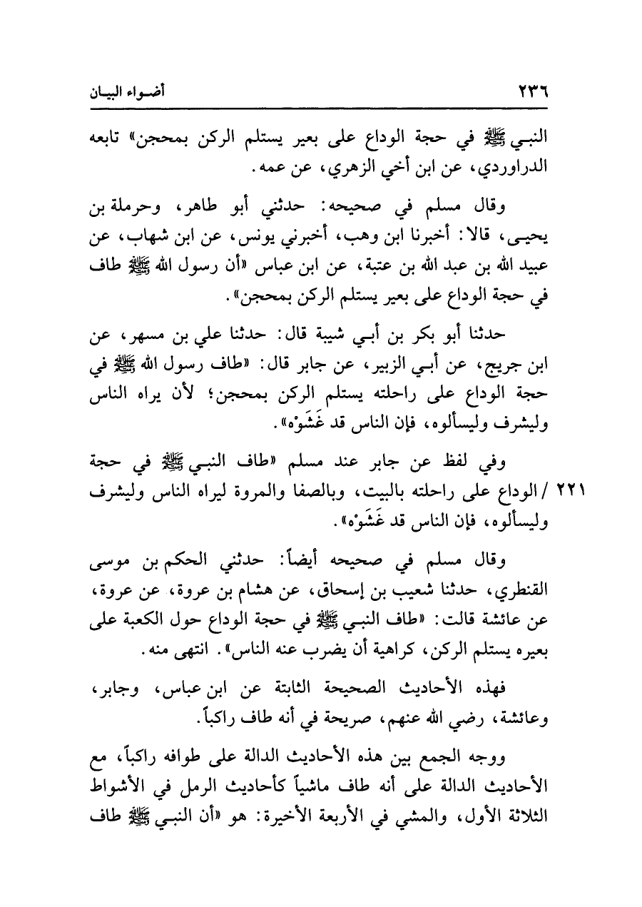 فهذه الأحاديث الصحيحة الثابتة عن ابن عبَّاس، وجابر، وعائشة، رضي الله عنهم، صريحة في أنَّه طاف راكبًا.